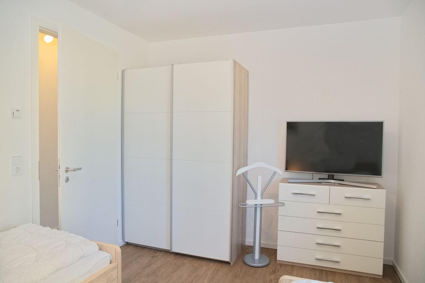 Auch das zweite Schlafzimmer besticht mit einem Doppelbett und hochwertigen Matratzen (ca. 180x200cm). Ein Flat- TV darf hier selbstverständlich nicht fehlen! In dem Kleiderschrank und der Kommode finden Sie ausreichend Stauraum für Ihre Urlaubsgarderobe.