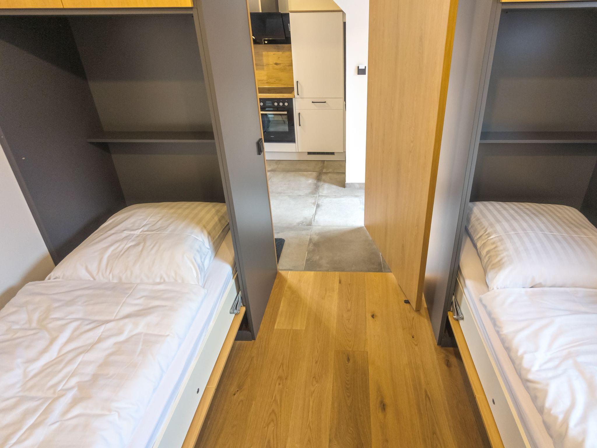 Die modernen, lichtdurchfluteten Wohnungen befinden sich im zweiten Stock und haben alle einen Balkon mit großartigem Elbblick. Die Wohnungen haben zwei Schlafzimmer, Badezimmer und Wohnzimmer mit Küchenzeile. Das zweite Schlafzimmer ist mit Einzelstehenden Wandklappbetten. Die Wohnungen sind per Fahrstuhl erreichbar und haben alle einen PKW-Stellplatz und Stellplätze und Ladepunkte für E-Bikes.