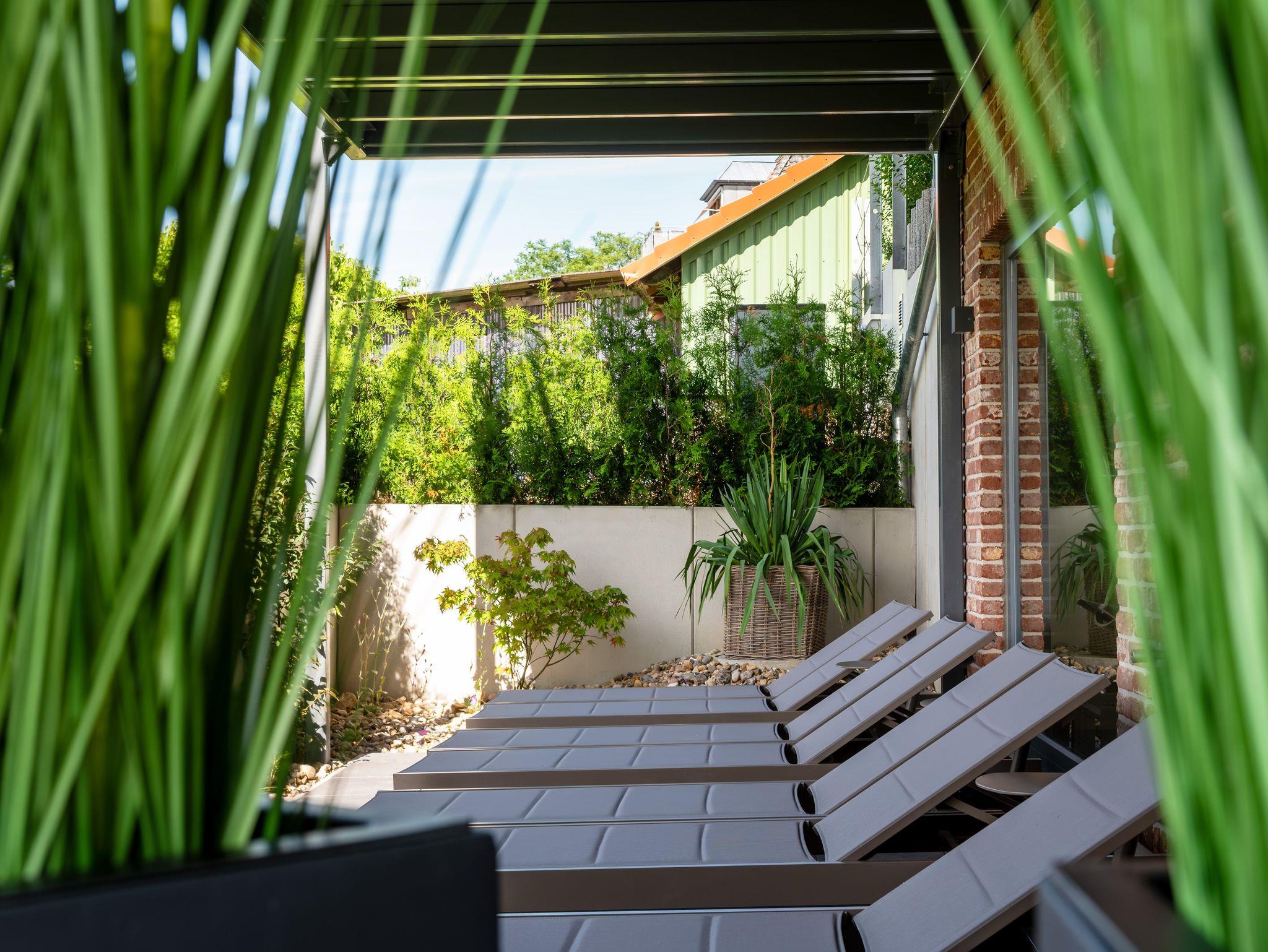 Die modernen, lichtdurchfluteten Wohnungen befinden sich im Erdgeschoß und haben einen schönen großen Balkon mit Blick auf Kirschbäume.