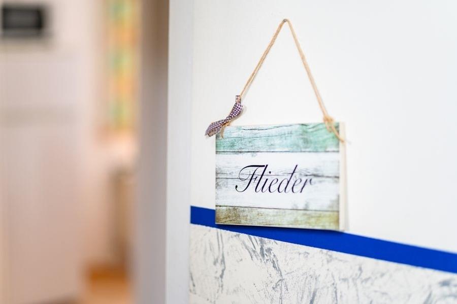 Die Ferienwohnung „Flieder“ befindet sich im 1. Stock des Haupthauses der Villa Christiana. Auf gut 80 Quadratmetern befinden sich ein Flur, eine Durchgangsküche mit Tisch, ein kleines Badezimmer (DU/WC), ein Wohnzimmer mit Esstisch und 2 Doppel-Schlafsofas, ein Schlafzimmer mit Doppelbett (Durchgangszimmer) sowie ein sich durch eine Glastür & -fenster-Kombination (SZ 1 war ursprünglich eine der vielen Villen-Veranden) anschließendes zweites Schlafzimmer mit einem Doppelbett (ohne weiteres Fenster). An das zweite Schlafzimmer schließt sich ein weiteres kleines Badezimmer (DU/WC) an.