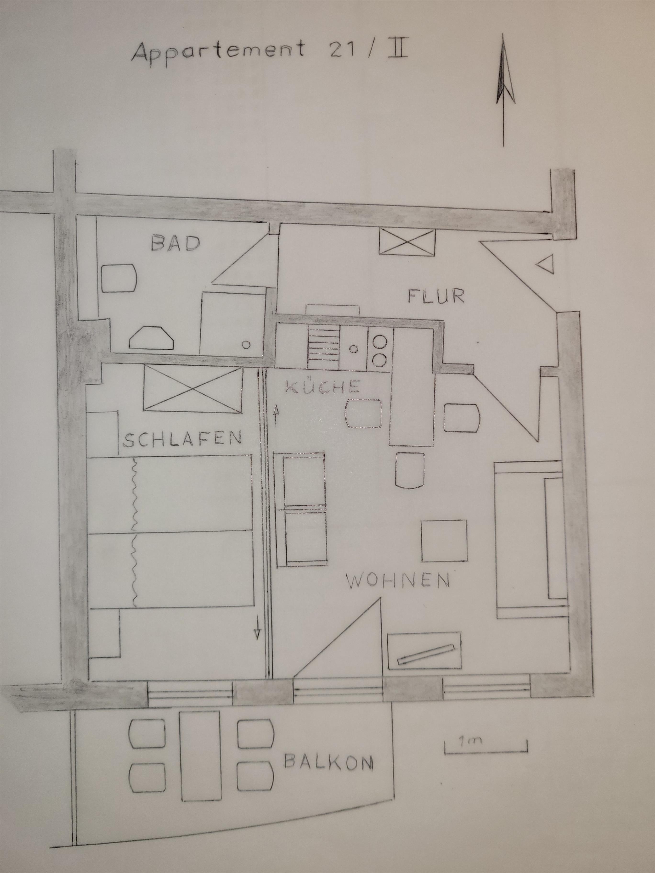 Die Ferienwohnung befindet sich im 2. Obergeschoß an der Südseite eines Ferienappartementhauses mit Tiefgarage und Fahrstuhl. Die Wohnung ist für 3 Personen in Familienformation, für 3 Jugendliche oder für 2 Erwachsene mit Kleinkind ausgelegt. Die Abtrennung zwischen Wohn-und Schlafbereich erfolgt durch ein Schiebewandsystem. Wir weisen darauf hin, dass diese Abtrennung nicht schallisoliert ist.