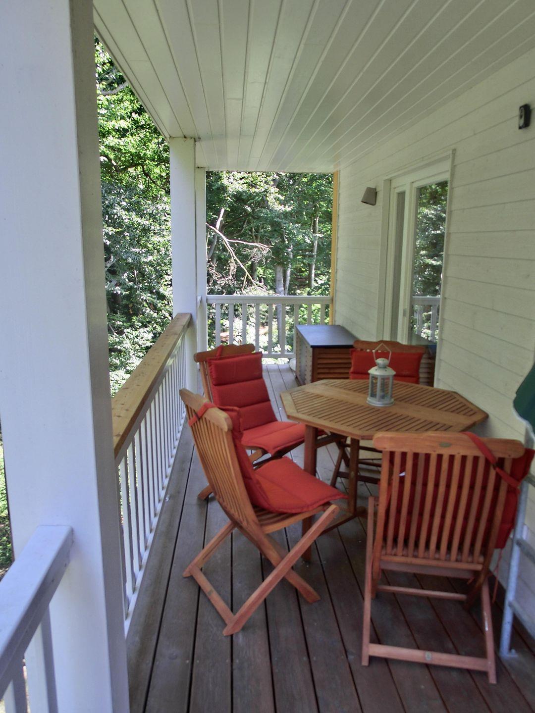 - großer möblierter Balkon aus Holz und Sonnenschirm