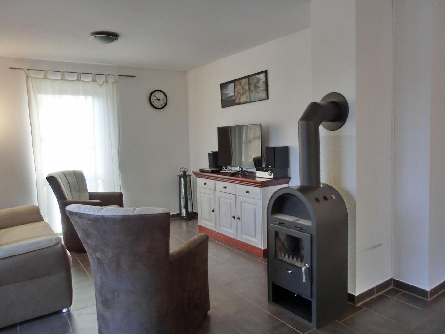 - Wohnbereich mit Kaminofen, Fußbodenheizung, Sitz- und Essecke,
