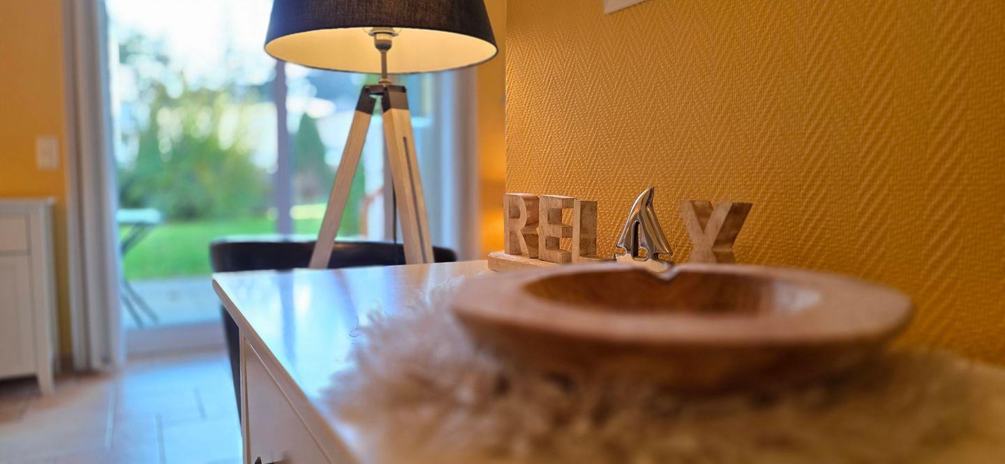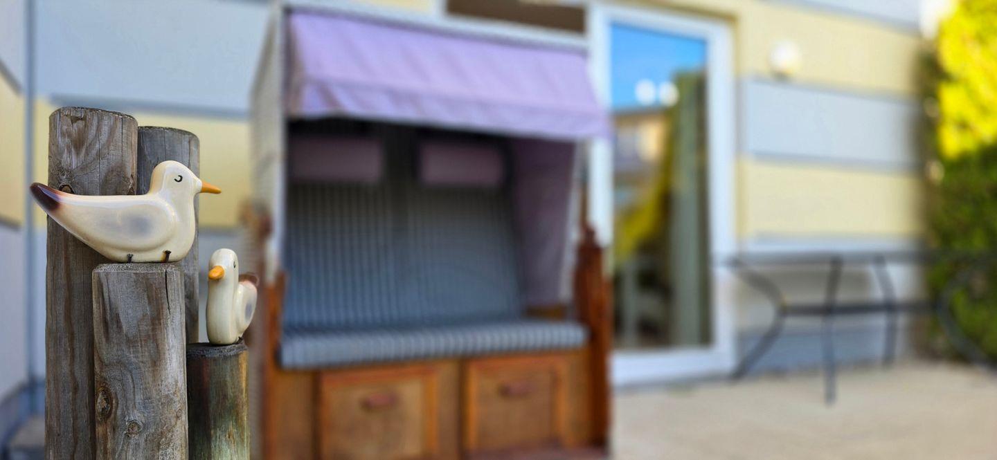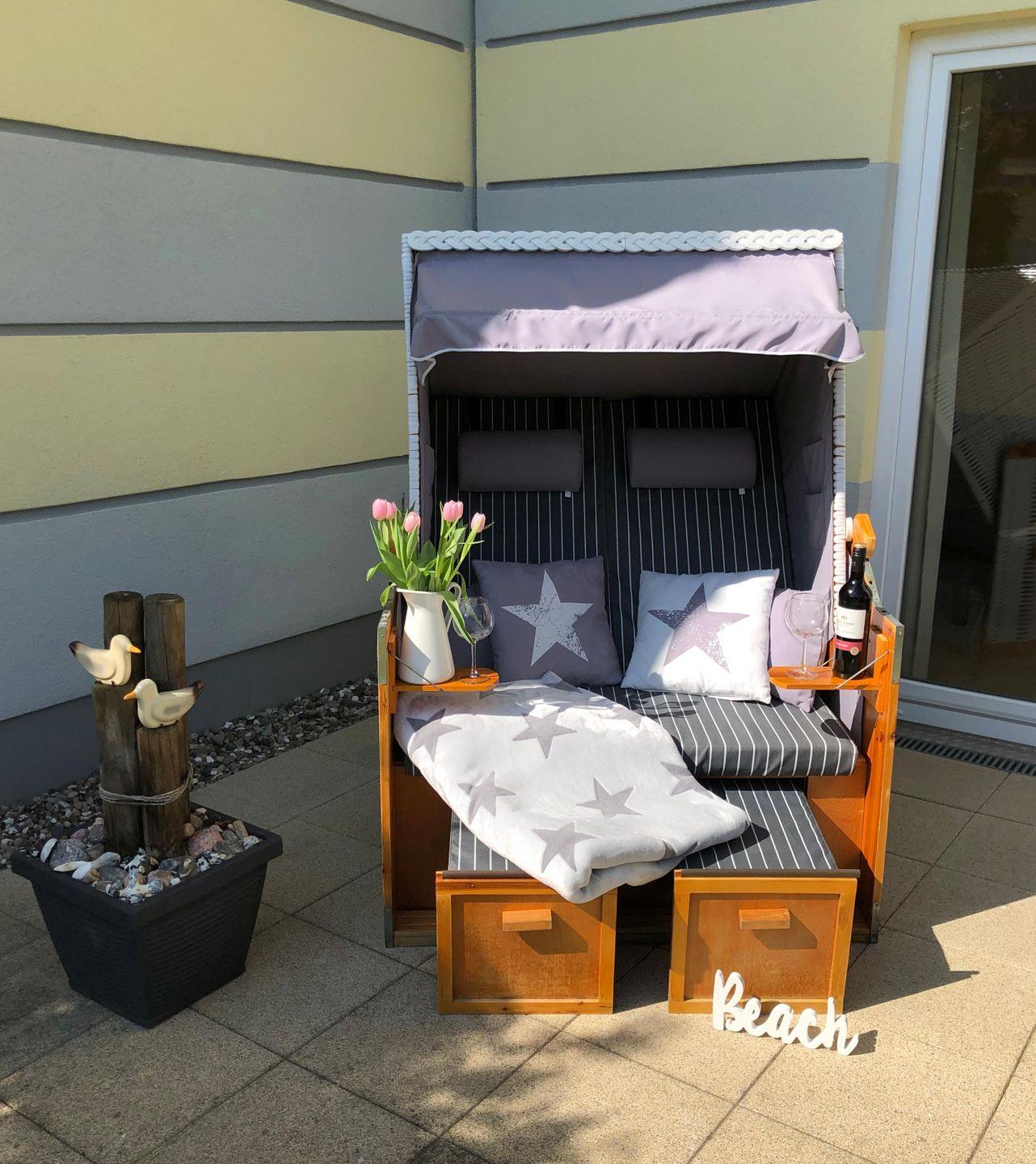 • Möblierte Terrasse mit ca. 100 m² Gartenanteil und einem Strandkorb