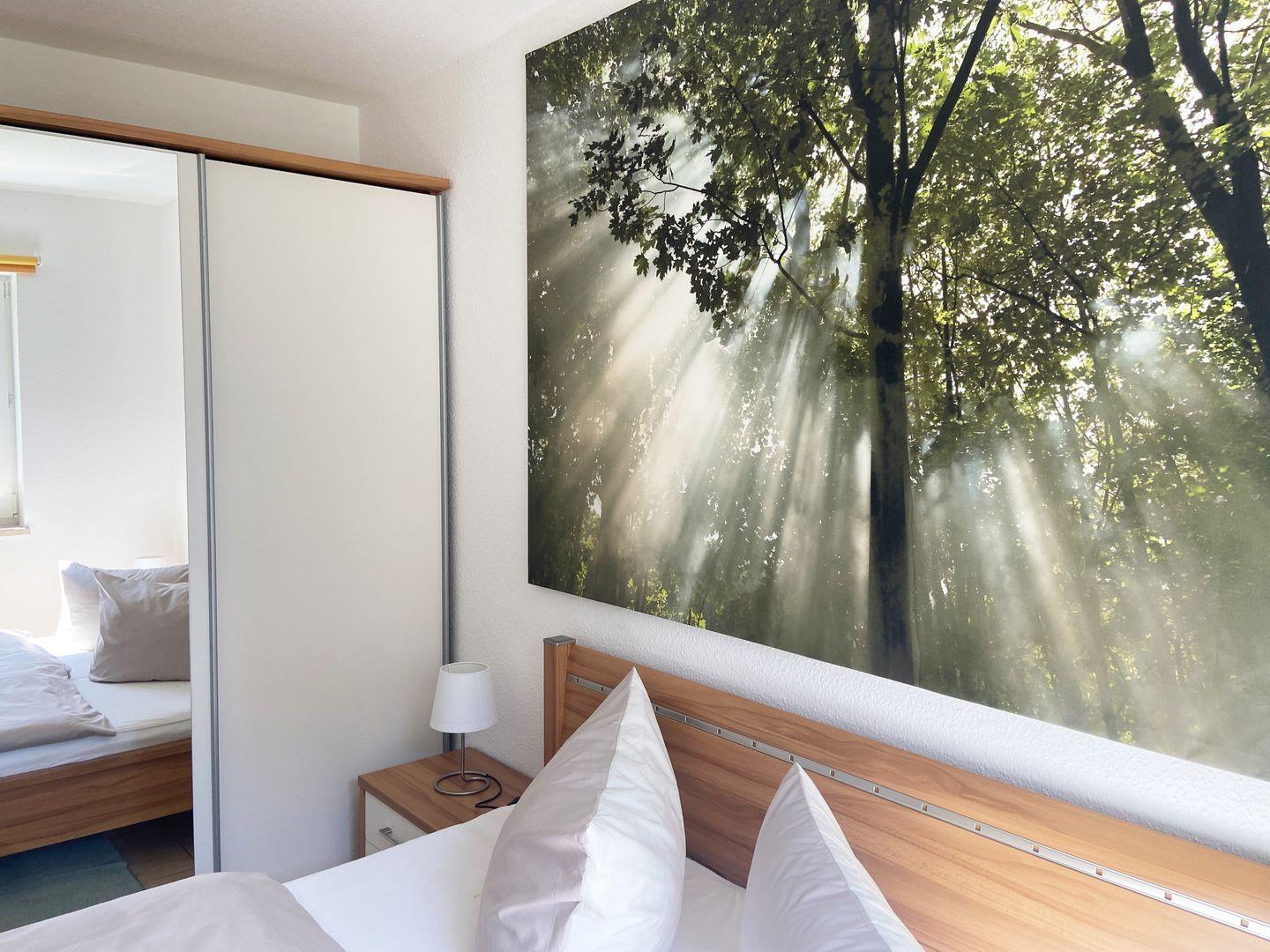 Die Wohnung verfügt über zwei Schlafzimmern. Das erste Schlafzimmer hat ein Doppelbett mit den Maßen 180 cm x 200 cm (geteilte Matratze) und das zweite Schlafzimmer hat ein Doppelbett mit den Maßen 160 cm x 200 cm (geteilte Matratze).