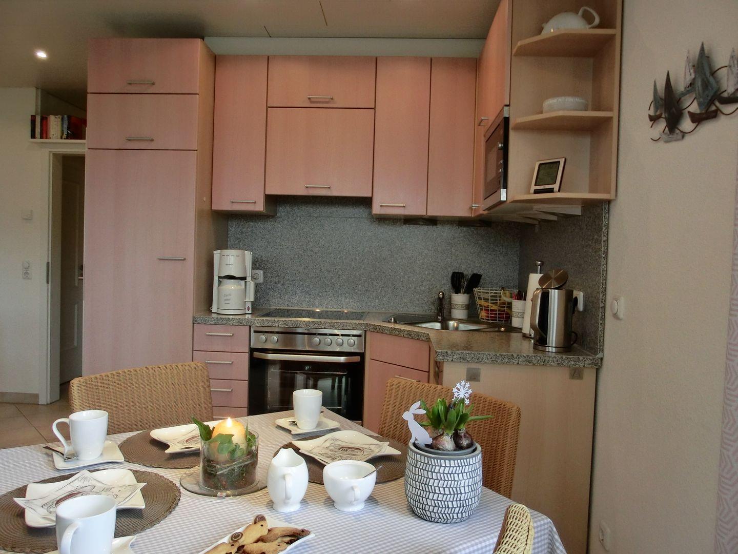 - einen Wohnraum mit offener Küche inklusive Geschirrspülmaschine, Herd und Backofen, Mikrowelle, Wasserkocher, Toaster, Kühlschrank mit Gefrierfach sowie ausreichend Geschirr