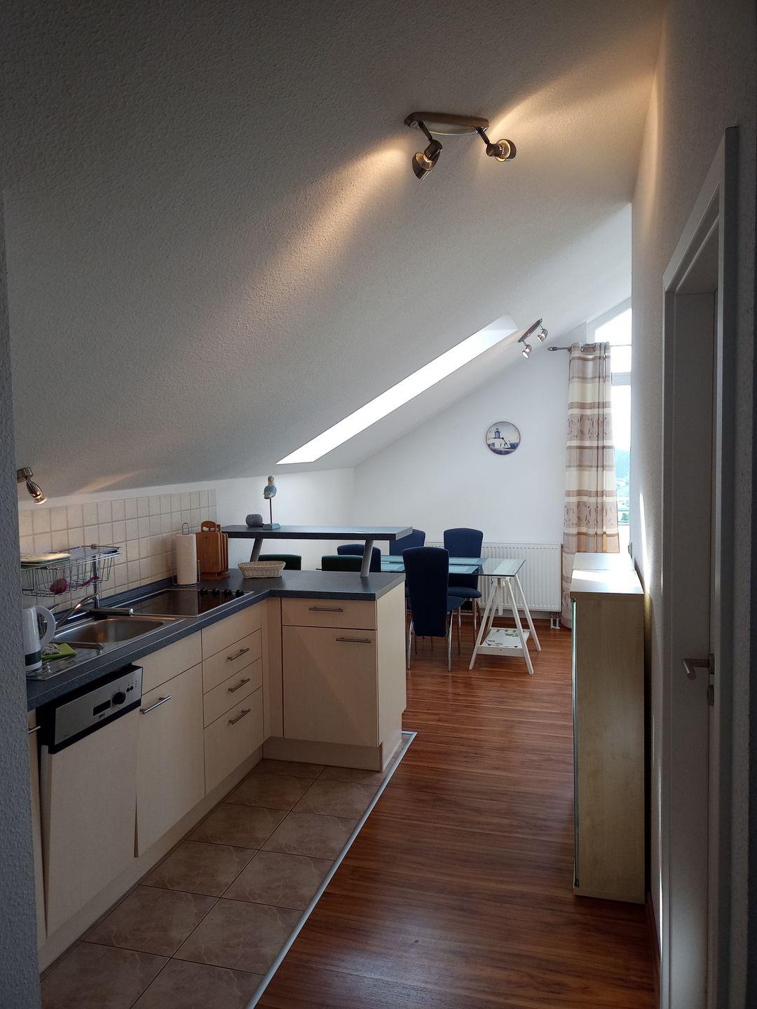 Die Wohnung verfügt über einen offenen Wohn- und Essbereich mit separatem Schlafzimmer (Doppelbett für 2 Personen, Schrank und Kommode), Bad mit Dusche, eine Abstellkammer mit Waschmaschine sowie ein Süd-West-Balkon mit Meerblick am Horizont. Im Wohnzimmer befindet sich eine Schlafcouch mit Aufbettung für 2 weitere Personen, zum Beispiel Ihre Kinder oder Freunde. Sie können zudem kostenfrei WLAN nutzen. Ein fester Parkplatz für Ihren PKW sowie Stellplätze für Ihre Fahrräder draußen oder im Fahrradkeller sind vorhanden.