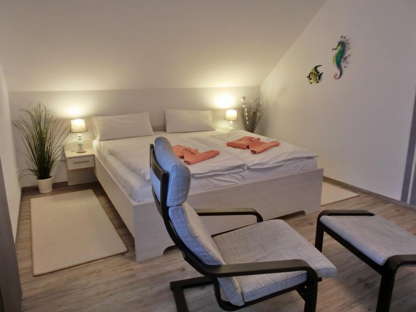 - Schlafzimmer mit Komfort-Doppelbett 180 cm x 200 cm