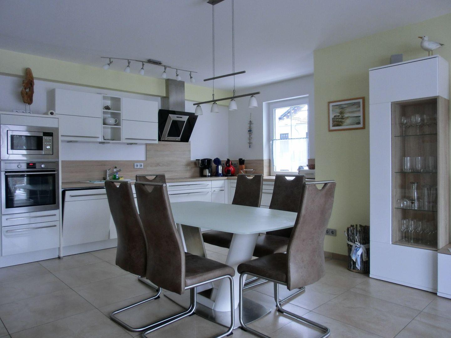 - offene, gut ausgestattete Küche inkl. Geschirrspülmaschine, Induktionsherd, Backofen, Mikrowelle, Kühlschrank mit kleinem Gefrierteil, Kaffeemaschine und Pad-Maschine, Wasserkocher, Toaster, Geschirr, Besteck und Gläser ausreichend vorhanden