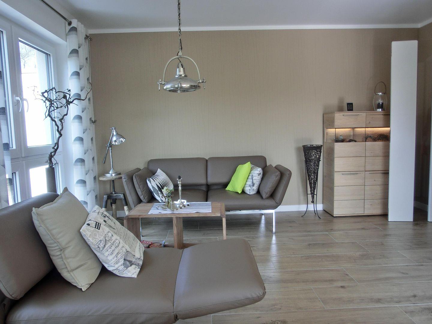 - modern eingerichteter und heller Wohnbereich mit Kaminofen, gemütlicher Sitzecke, 3 D TV, Radio, CD und Blu-Ray Player