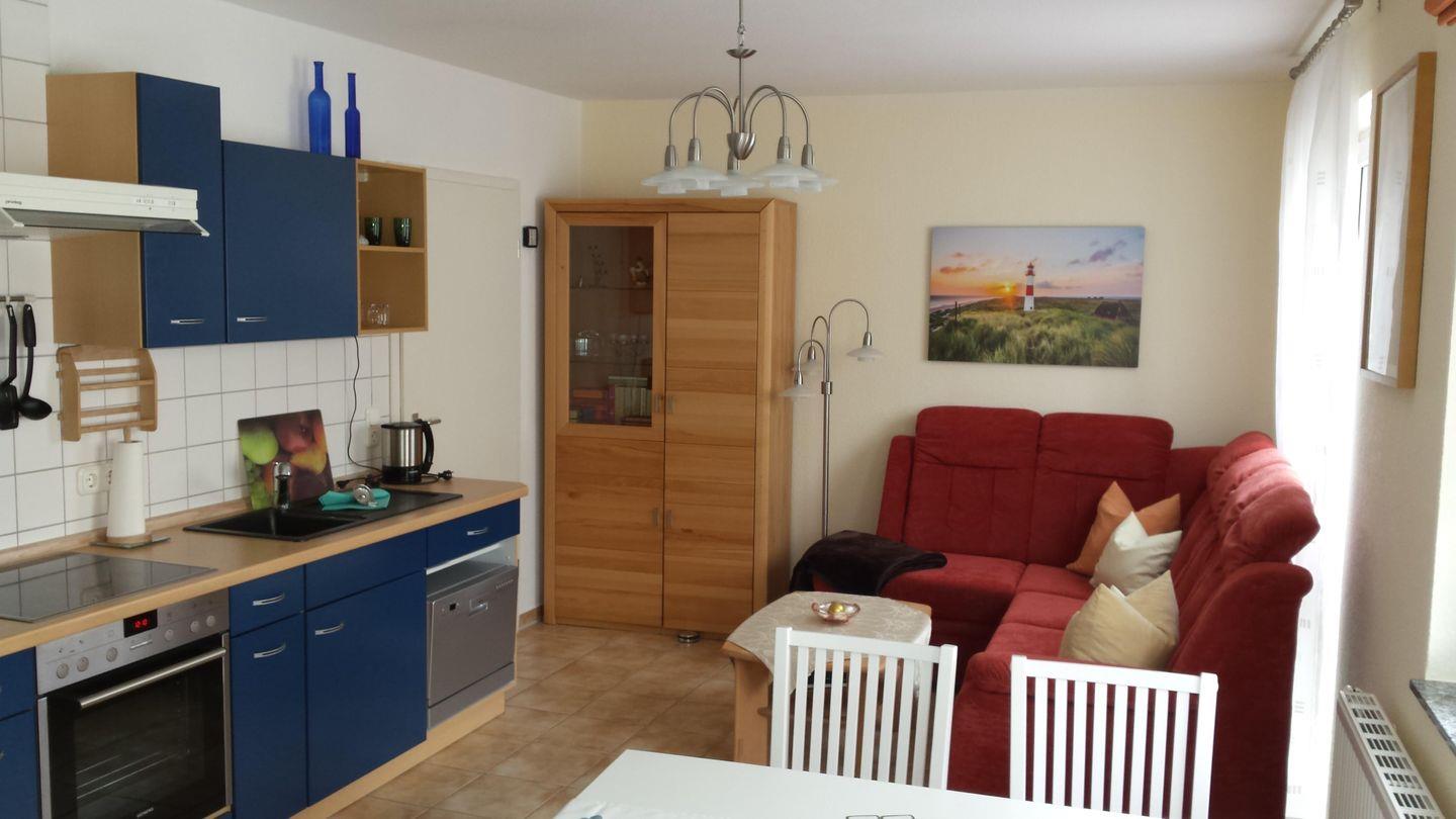 - offene Küche inkl. Herd mit Backofen, Kühlschrank mit kleinen Gefrierteil, Spülmaschine, Kaffeemaschine, Toaster, Mikrowelle, Wasserkocher
