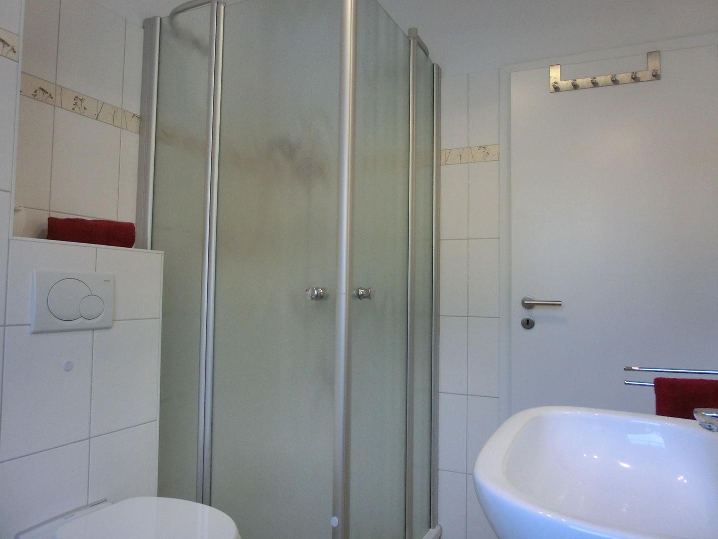Ein modernes Badezimmer mit Dusche, WC, Bidet und Waschmaschine rundet das Angebot ab.
