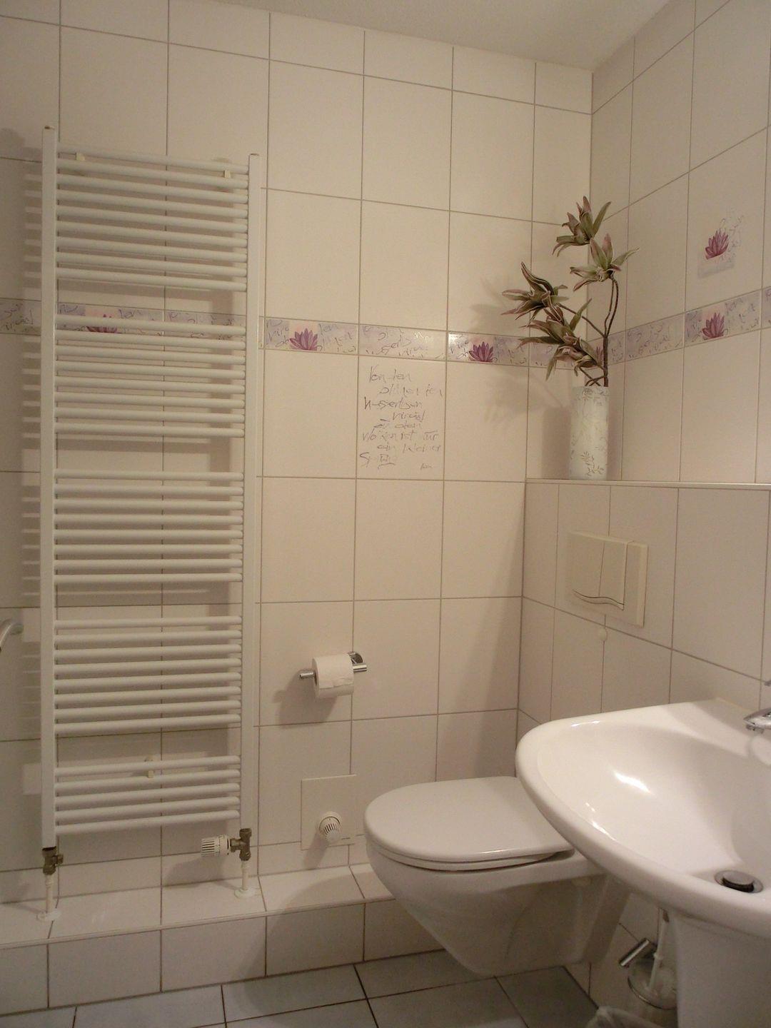 - ein Badezimmer mit Dusche, WC, Heizkörper und genügend Ablagefläche