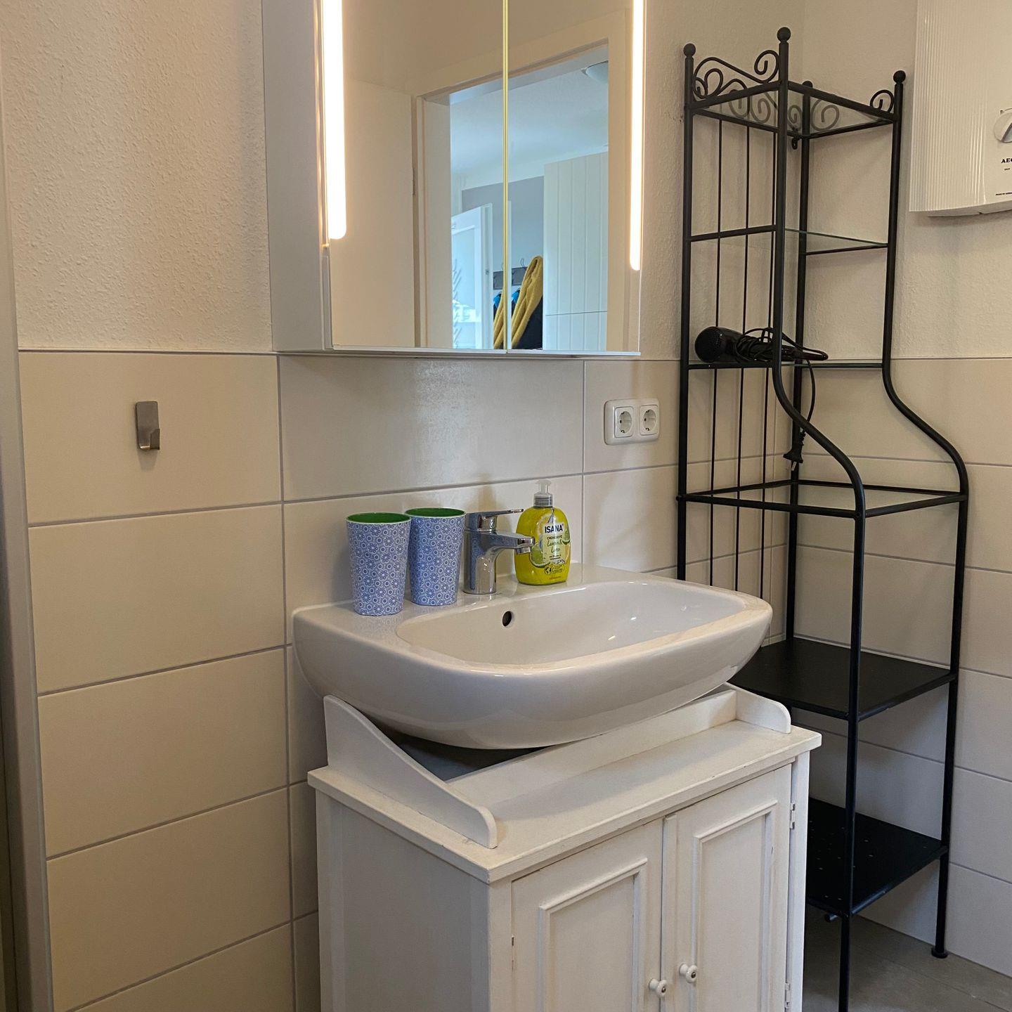 - Badezimmer mit ebenerdiger Dusche, WC, Waschbecken und genügend Ablagefläche