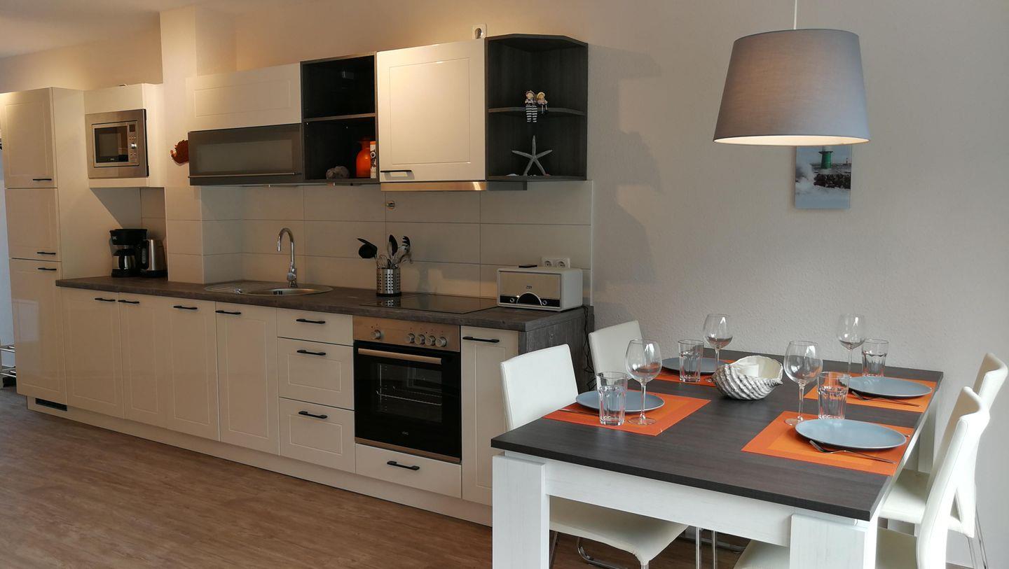 - offene Küche inkl. Herd mit Backofen, Geschirrspülmaschine, Kühlschrank mit Gefrierfach, Kaffeemaschine, Mikrowelle, Toaster, Wasserkocher, Geschirr, Besteck und Gläser sind ausreichend vorhanden