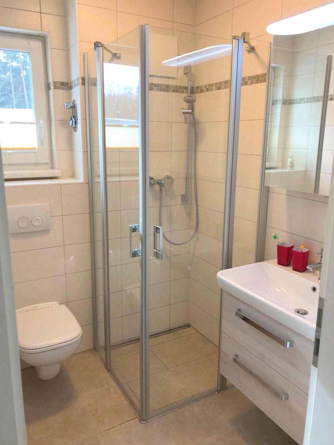 - Tageslichtbad (vor Fenster Plissee) mit ebenerdige Dusche und WC, Fön