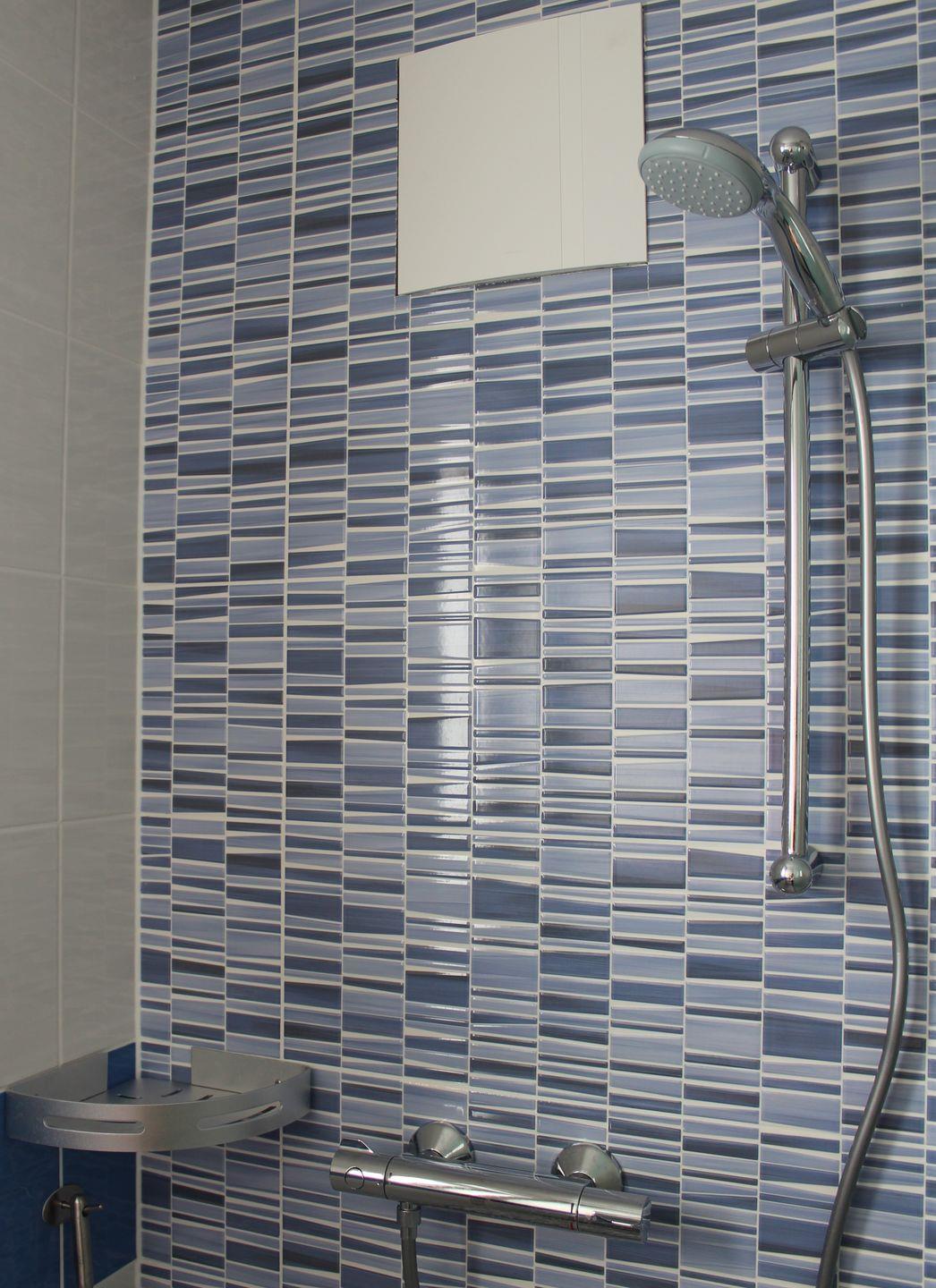 - Duschbadezimmer mit ebenerdiger Dusche, großem LED-Spiegel, Vergrößerungsspiegel , Föhn und elektrischem Handtuchheizkörper