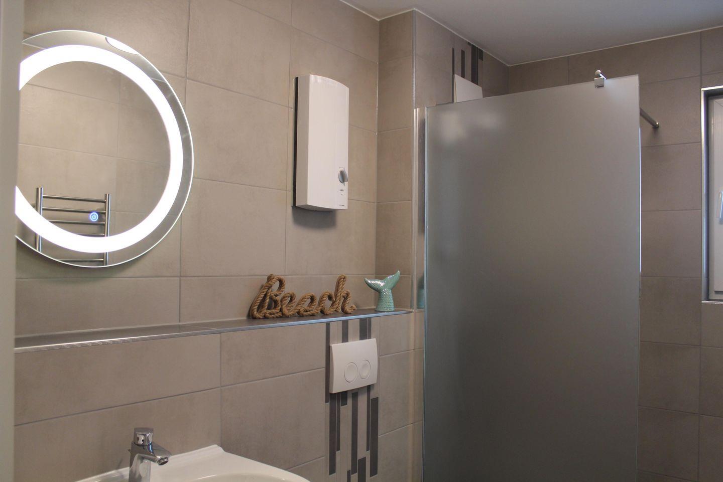 - Badezimmer mit ebenerdiger Dusche, großem LED-Spiegel, Vergrößerungsspiegel , Föhn und elektrischem Handtuchheizkörper
