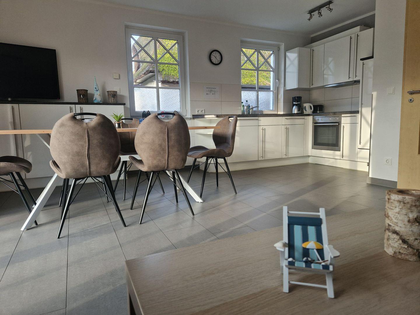 - Die Küche verfügt über eine reichhaltige Ausstattung inkl. Geschirrspülmaschine, Herd und Backofen, Kühlschrank mit Gefrierteil, Mikrowelle, Kaffeemaschine, Toaster, Wasserkocher.