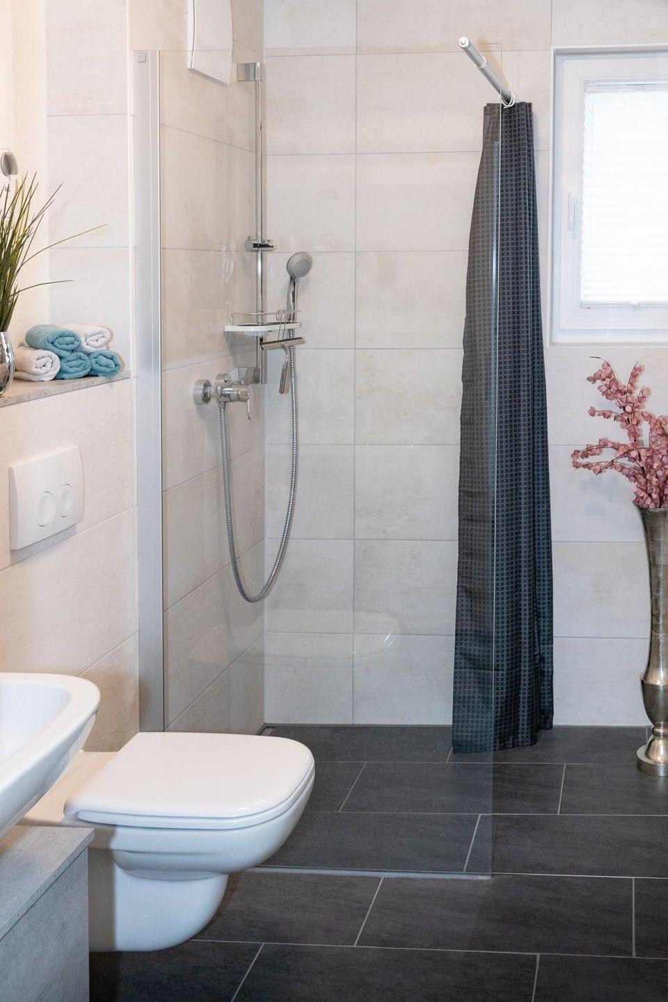 - Tageslichtbad mit WC, einer ebenerdigen Dusche, Fön, beheizbarer Handtuchhalter und genügend Ablagefläche
