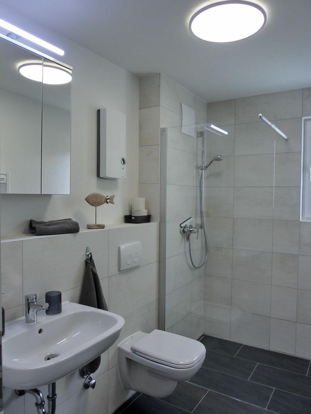 - Tageslichtbad mit ebenerdiger Dusche, Föhn und genügend Ablagemöglichkeiten