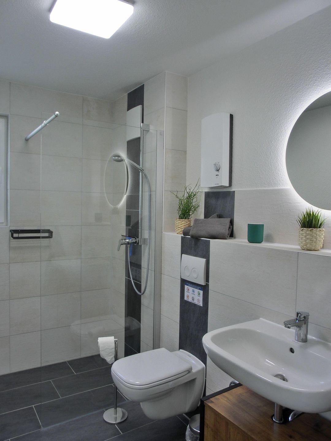 - Das moderne Tageslichtbad bietet neben ebenerdiger Dusche, WC, Fön und Waschtisch, genügend Ablagefläche.