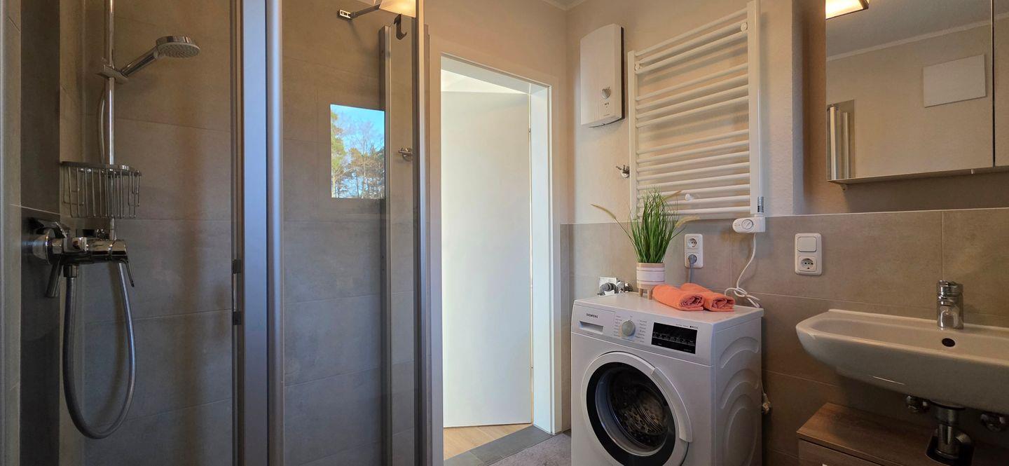 - Tageslichtbad mit ebenerdiger Dusche und WC, Waschmaschine, Handtuchheizkörper und Fön