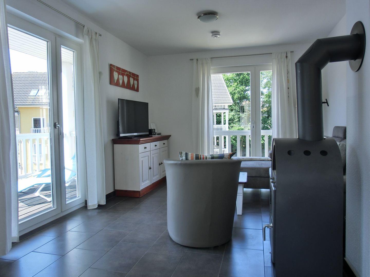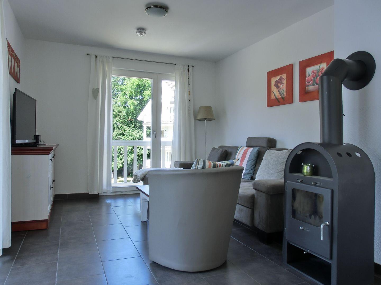 - Wohnbereich mit Kaminofen, Fußbodenheizung, Sitz- und Essecke, Sat-TV, Radio, CD-Player