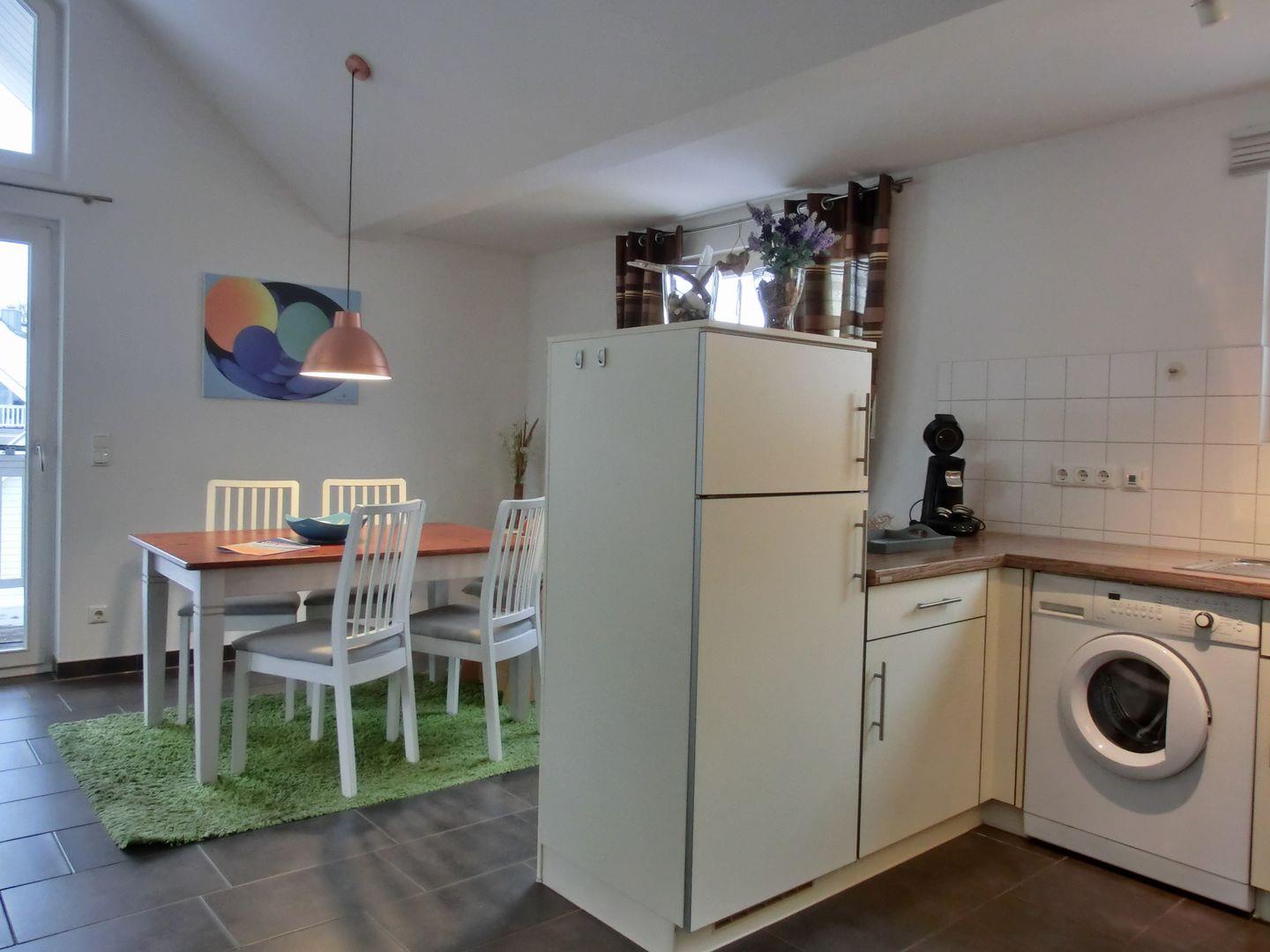 - in separater Ecke im Wohnraum eine Einbauküche inkl. Geschirrspüler, Waschmaschine, Herd, Backofen, Mikrowelle, Kaffeemaschine, Wasserkocher, Toaster und Kühlschrank mit Gefrierteil