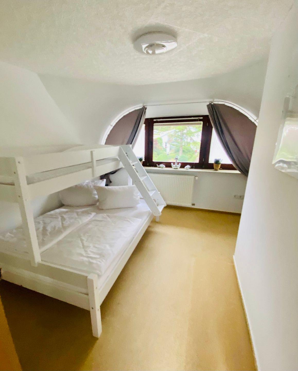 Das zweite Schlafzimmer verfügt über ein Etagenbett, welches gerade bei unseren kleinen Gästen sehr beliebt ist. Die untere Liegefläche bietet Platz für zwei Personen (140x200m) und die obere für eine weitere (90x200m). Hier finden Sie ebenfalls einen Kleiderschrank.