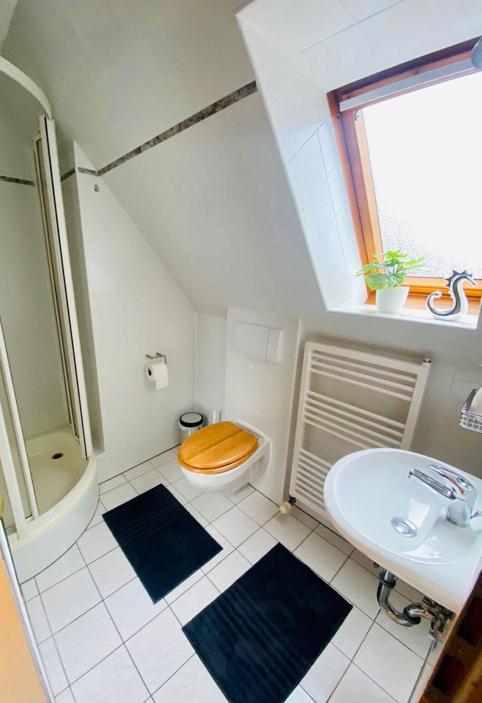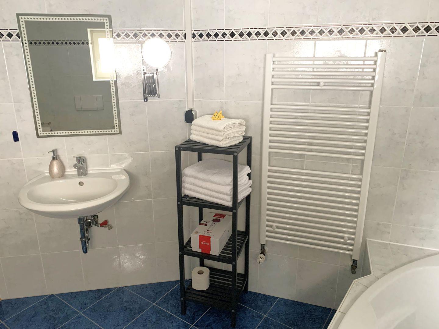 Im ersten Badezimmer erwartet Sie eine große Whirlpool-Eckbadewanne in der Sie Duschen, oder entspannte Abende zu zweit genießen können.