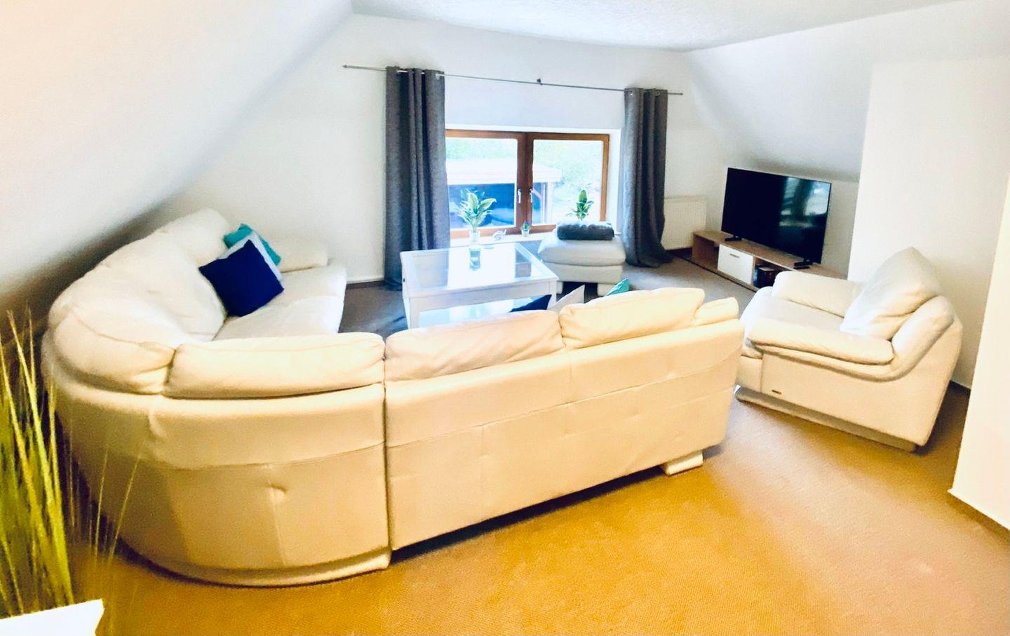 Das Wohnzimmer lädt mit der großzügigen Eckcouch zu gemütlichen Filmabenden vor dem Smart- TV (Netflix etc.) ein. Hier ist ein weiteres Bett für zwei Personen (160x200m). Die großzügige Terrasse die an den wunderschönen Garten grenzt, lädt zu gemütlichen Grillabenden ein. Der Sonnenschirm und die Sonnenliegen, lassen Sie die Ostsee Luft genießen. Internet ist kostenlos verfügbar.