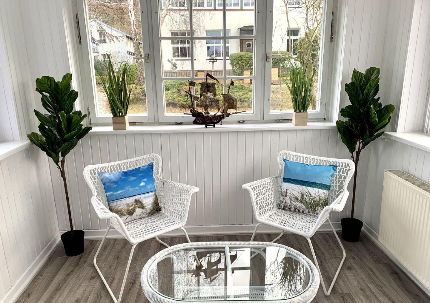 Der Sonnenschirm und die Sonnenliegen, lassen Sie die Ostsee Luft genießen.