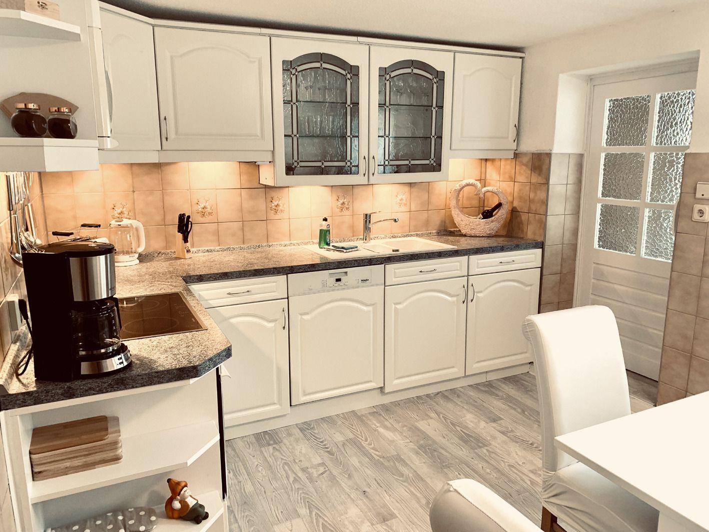 In der Küche im passenden Landhausstil kann man wunderbare Gerichte zaubern. Spülmashine, Herd, Backofen Mikrowelle und alles was man zum Kochen brauch, finden Sie in dieser tollen hellen Küche mit Esstisch.