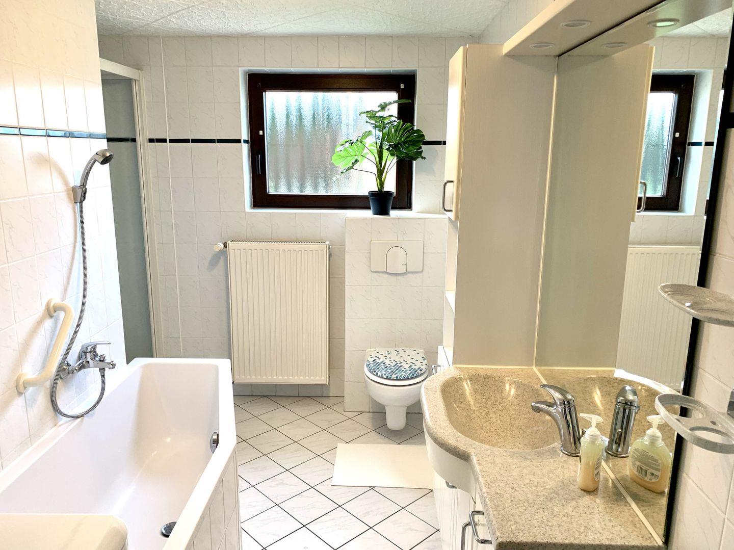 Das Tageslicht durchflutete Badezimmer, ist mit einer Dusche und einer Badewanne ausgestatttet. Ebenfalls finden Sie hier die Waschmaschine.