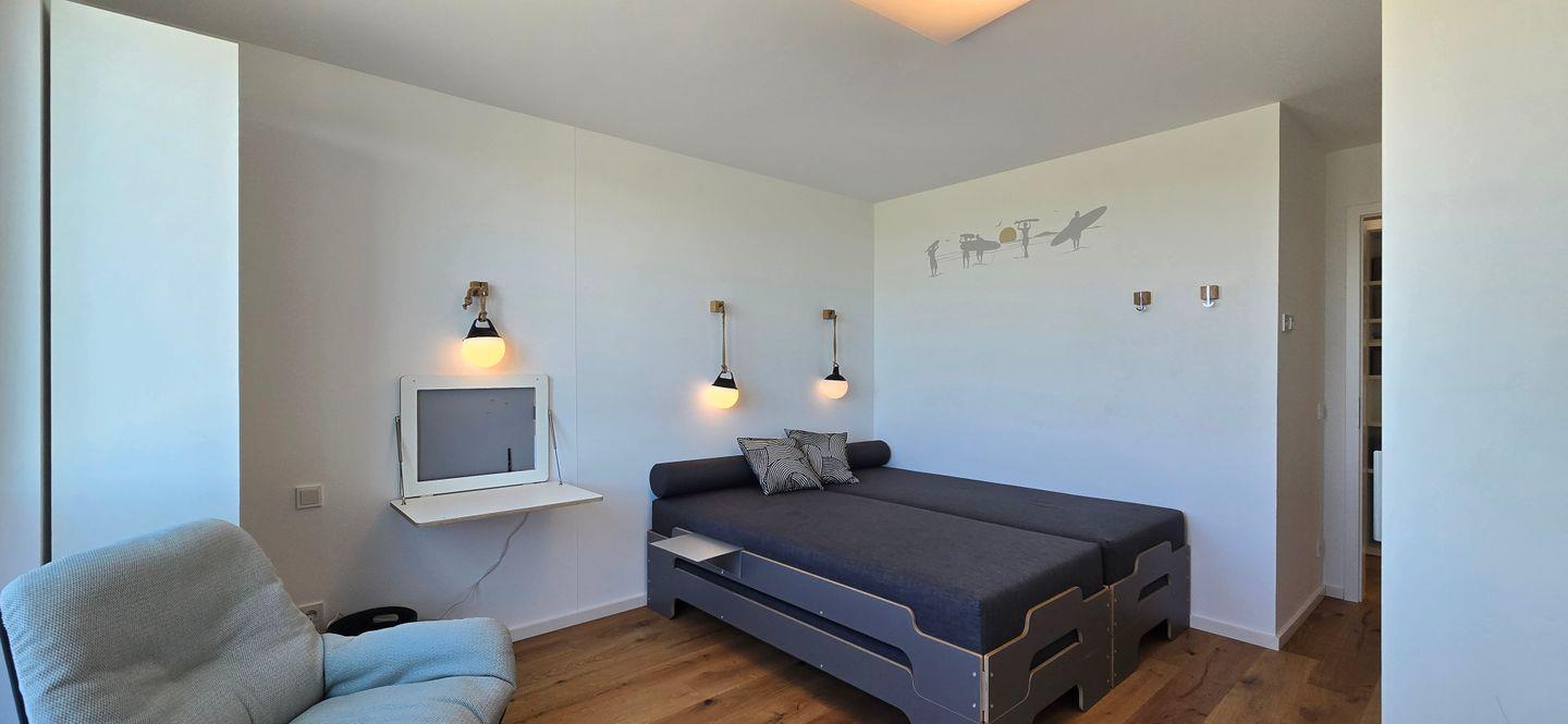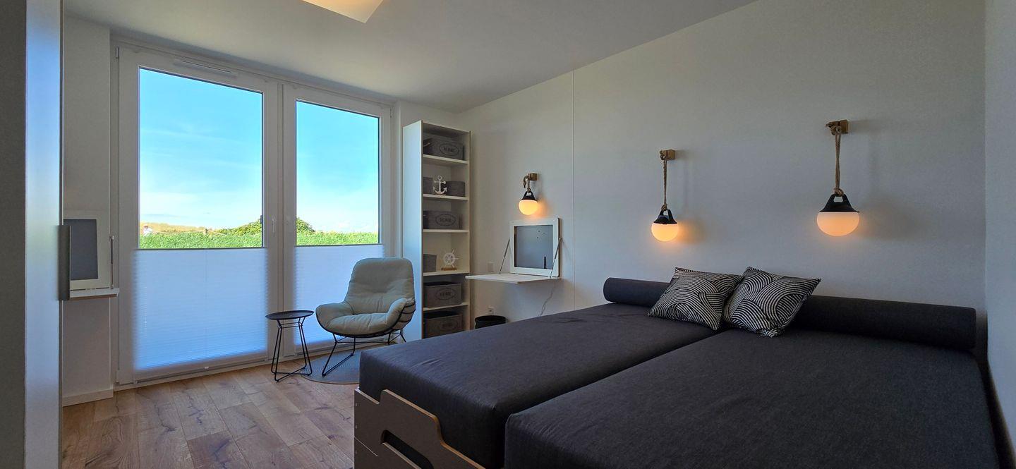 Ein separates Schlafzimmer bietet Schlafgelegenheiten für vier Personen (vier Einzelbetten, stapelbar). Die Couch im Wohnbereich kann für zwei weitere Personen umgebaut werden.