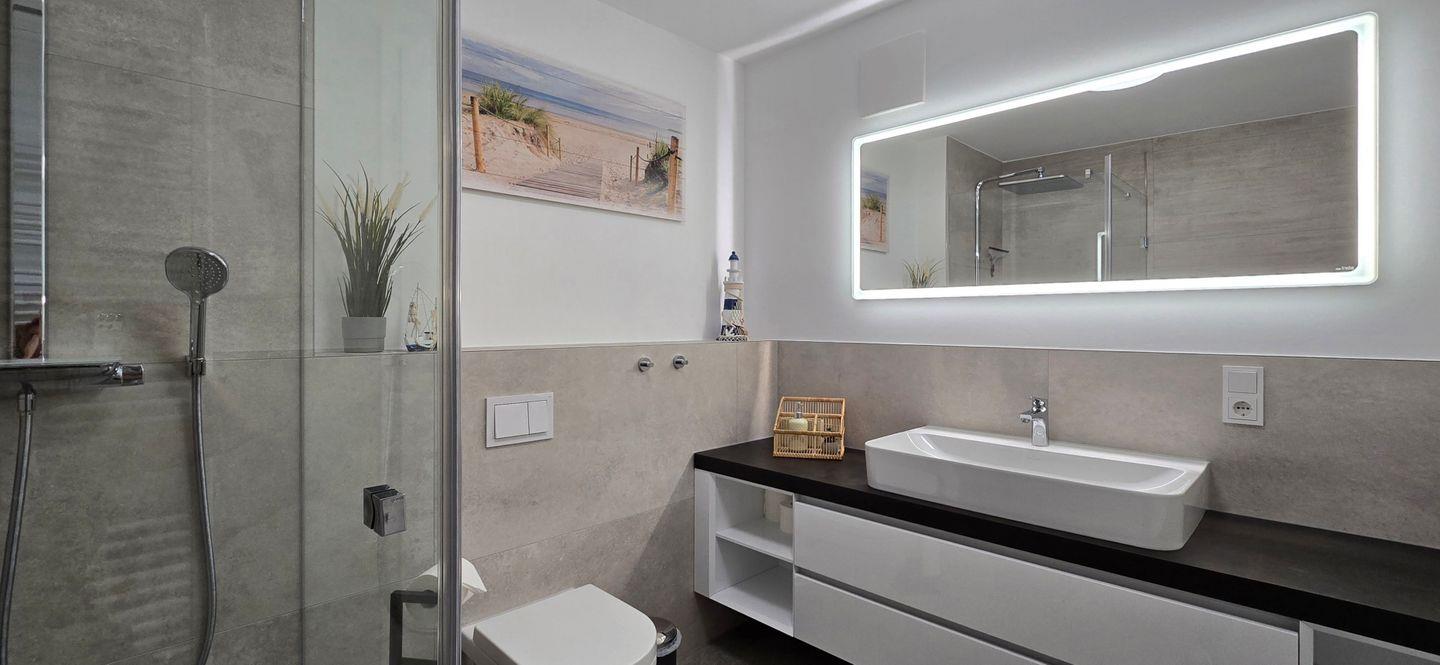 Das Badezimmer verfügt über eine moderne Dusche, Waschbecken, großes Spiegelglas, Haartrockner und ist selbstverständlich mit einem WC ausgestattet. Warme Duschen und ausreichend Platz runden das Bad für den täglichen Komfort ab.