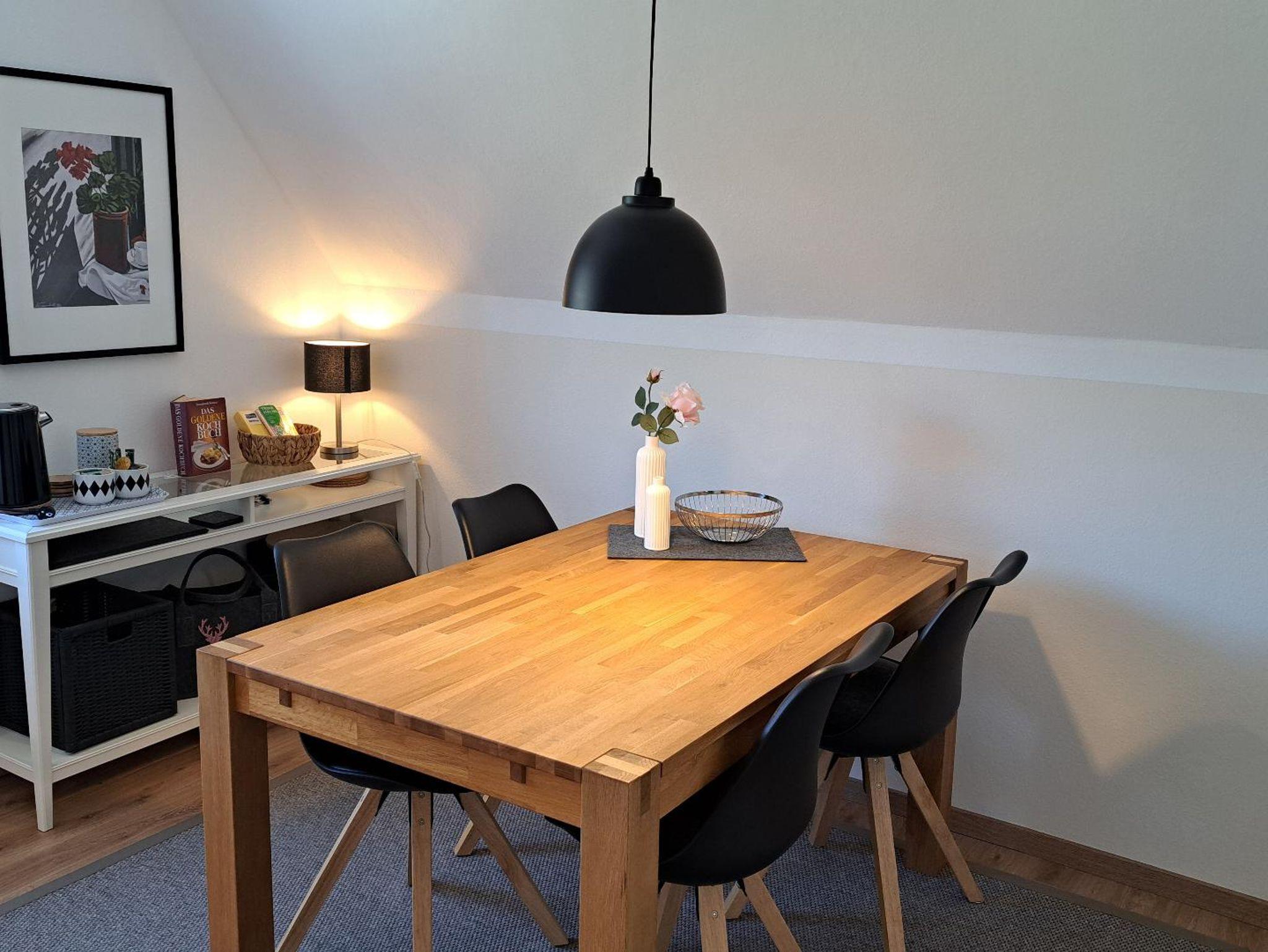 sich ein schönes Menü. Ein großer Esstisch mit vier Stühlen, praktisches