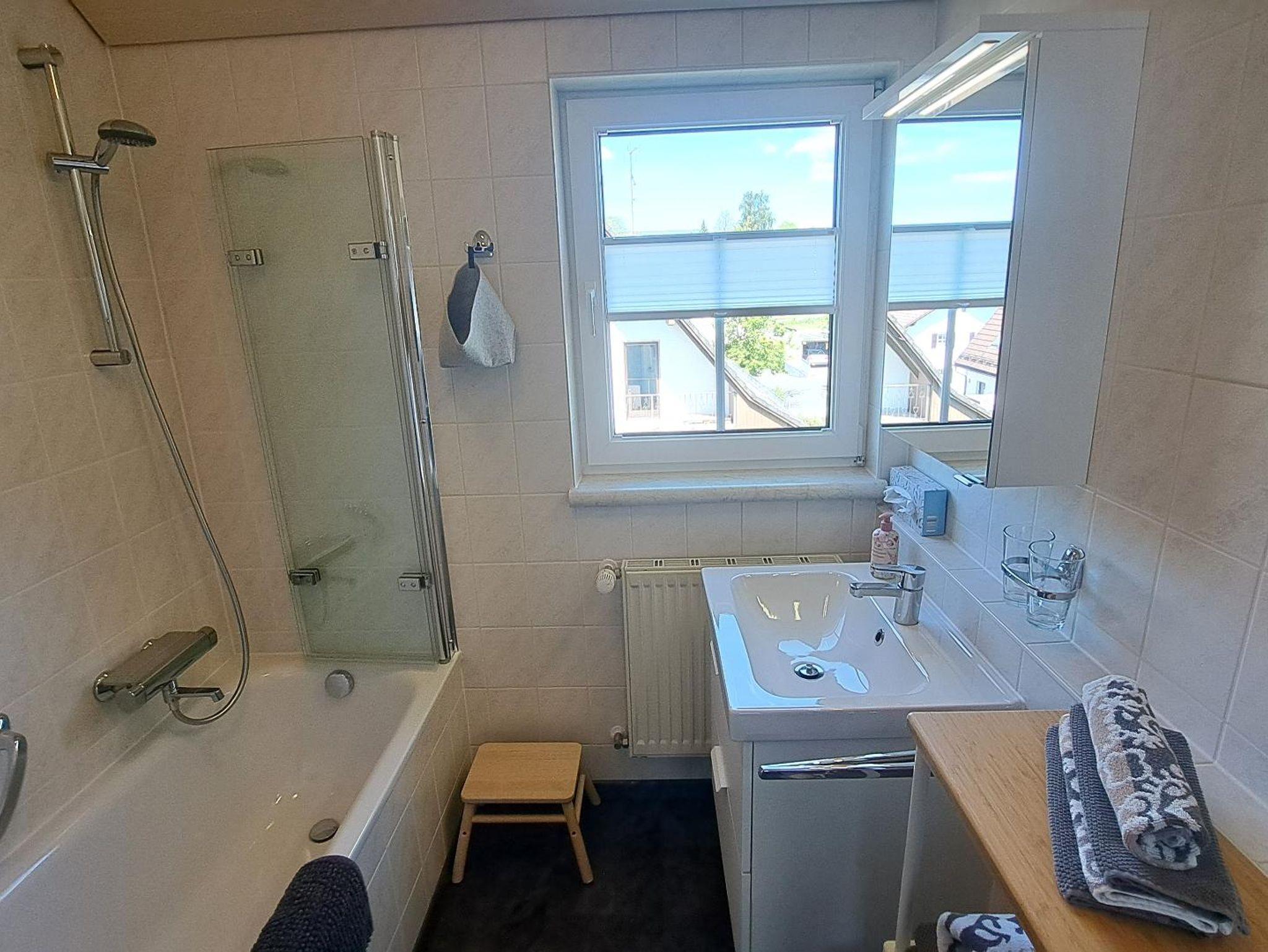 der Wohnung befindet sich ein Bad mit Badewanne/Dusche, Fön und Kosmetikspiegel,
