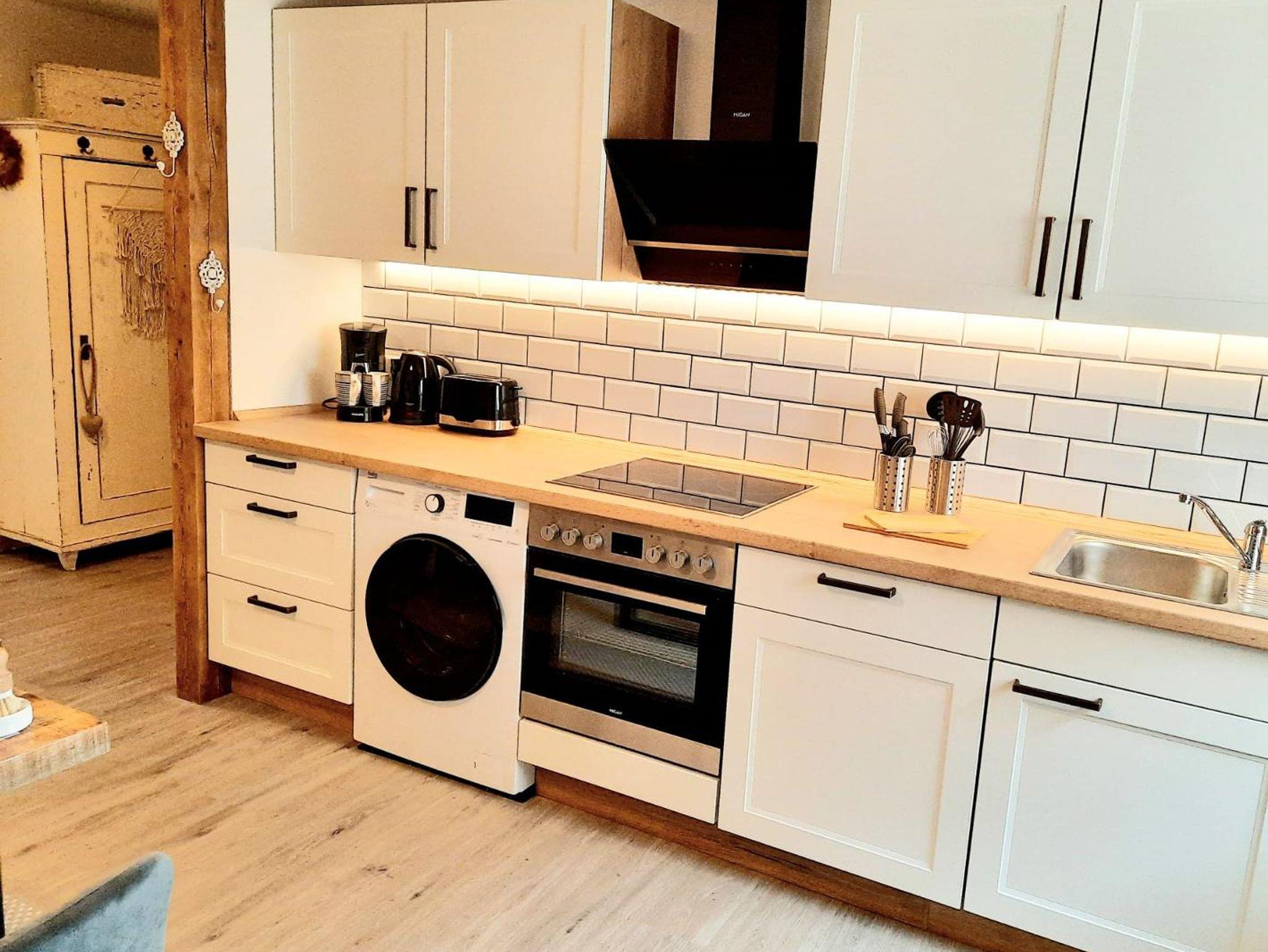 Die Küche ist ausgestattet mit Mikrowelle, Kühlschrank, Ceran-Kochfeld, Backofen, Waschtrockner, Geschirrspüler, Wasserkocher, Toaster, Kaffee/Espresso Pad-Maschine. Smart-TV im Wohn- und Schlafzimmer, freies WLAN, Bettwäsche, Bade- und Handtücher, Geschirrtücher, Fön und Bügeleisen sind inklusiv. Allergiker-Betten und Wendematratzen (hart/weich) sorgen für einen erholsamen Schlaf.
