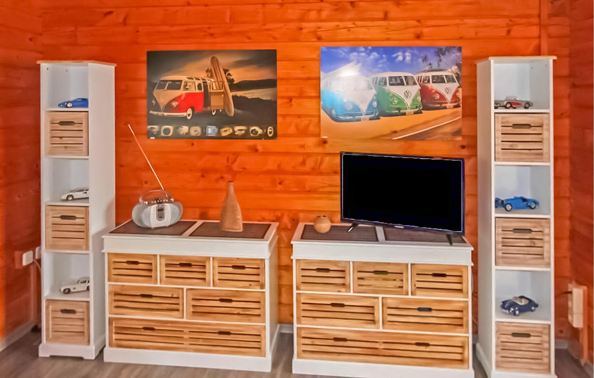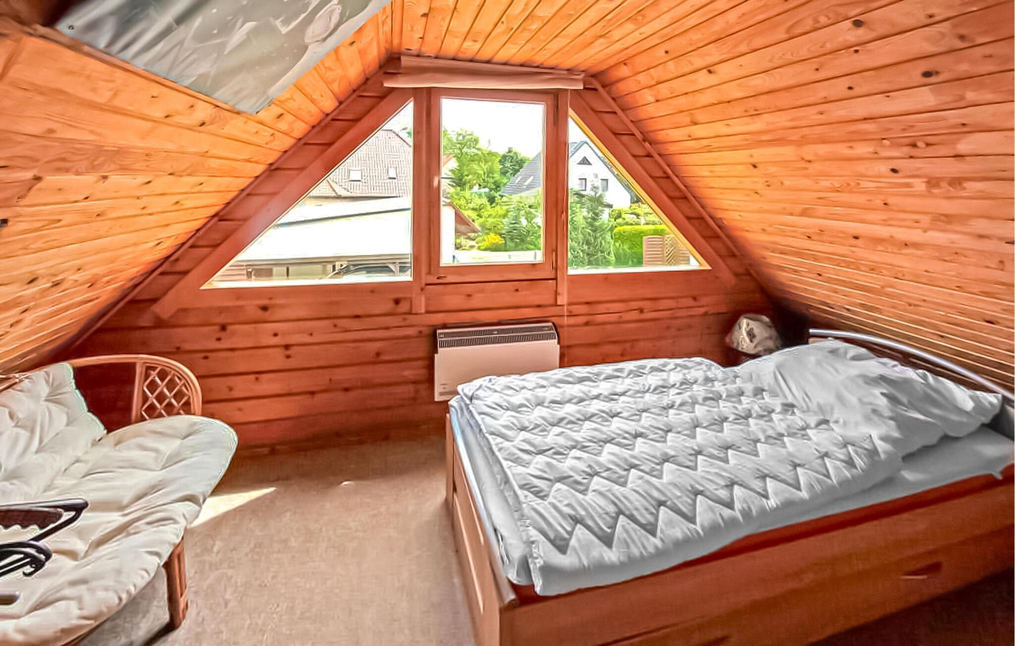 Feriehuset i skandinavisk bjælkehyttestil ligger på en stor, separat grund i en meget rolig beliggenhed, ca 800 m fra stranden ved Szczecin-lagunen. Det er rustikt indrettet med opholdsstue (polstrede møbler med sovefunktion, fladskærms-tv, radio), åbent tekøkken (elkomfur med ovn, køleskab med fryser, spisebord, diverse køkkenmaskiner), 2 soveværelser via stejle trapper ( 1 x dobbeltseng, 1 x sammenklappelig seng), brus/WC, el-varme. Der er beskyttelseslåge til små børn på trappen på øverste etage Følgende er til rådighed: møbleret terrasse, altan med frit udsyn, grill og parkeringsplads Samlet pris inkluderer: slutrengøring og vandforbrug. Du kan medbringe dit eget sengelinned og håndklæder eller leje dem. Energi efter forbrug. Feriehuset er ikke egnet til gangbesværede på grund af de stejle trapper. Grambin er et lille feriested i et skovområde direkte ved Szczecin-lagunen, cirka 2 km fra den østligste havneby Seebad Ueckermünde (meget god turistinfrastruktur). Der er en stor badestrand med en legeplads ved lagunen. Takket være det veludviklede netværk af cykel- og vandrestier kan omgivelserne i Ückermünder Heide nemt udforskes selv uden bil. Gode fiskeforhold ved Zarow-floden.