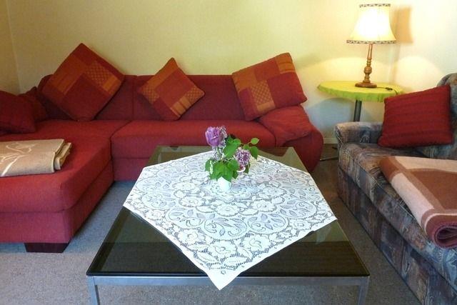 Das Ferienhaus im Grünen betreten Sie im Flur mit Flurgarderobe und einer Sitzbank. Von hier gelangen Sie in das Wohnzimmer mit zwei Couchen, einem Sessel, einem kleinen Tisch und dem Fernseher. Im Erdgeschoss befinden sich auch das Bad mit Dusche, Waschbecken, einem Hocker und dem WC, sowie die Küche und das Esszimmer. In der Küchenzeile befinden sich ein Spülbecken, ein Geschirrspüler, ein Herd mit Cerankochfeld, ein Kühlschrank mit Tiefkühlfach, eine Kaffeemaschine, ein Wasserkocher, ein Toaster und eine Brotschneidemaschine. Neben der Küchenzeile steht ein Tisch mit zwei Stühlen. Das nächste Zimmer ist das Esszimmer. Hier finden Sie einen großen Esstisch, ein Buffet, eine Kommode und ein Radio. Über eine schmale Treppe mit teils niedriger Kopffreiheit gelangen Sie ins Obergeschoss. Dort gibt es drei Schlafzimmer und ein Gäste-WC mit Waschbecken. Im oberen Flur sind eine Truhe und geräumige Einbauschränke in die Dachschräge eingebaut worden. So haben Sie genügend Platz zum Unterbringen für Ihre Garderobe und Koffer. Ein Schlafzimmer ist ausgestattet mit einem Doppelbett, einem Tisch mit zwei Stühlen und weiteren Einbauschränken. Das Schlafzimmer ist groß genug für eine oder zwei Aufbettungen. Von diesem Schlafzimmer aus gelangen Sie auf einen kleinen Balkon. Ein weiteres Schlafzimmer ist eingerichtet mit zwei Einzelbetten, die als Doppelbett oder getrennt stehen können, einem Stuhl und einer Kommode. Auch hier wäre Platz für eine Aufbettung. Das dritte Schlafzimmer hat ein Etagenbett und eine Kommode. Die Aufbettungen erfolgen einfach über Matratzen, die hingelegt werden wo Sie es wünschen. Im Garten gibt es eine kleine alte Glaslaube mit Gartenmöbeln. An kühlen Tagen oder Abenden können Sie sich gern darin aufhalten. Am Haus befindet sich eine überdachte Terrasse mit Gartenmöbeln. Sie können sich jedoch auch gerne ein anderes Plätzchen im Garten aussuchen. Ein Grill und eine Lagerfeuerschale sind vorhanden. Hinter dem Haus ist eine große Spiel und Liegewiese. Ihre PKW`s können auf dem Grundstück geparkt werden.