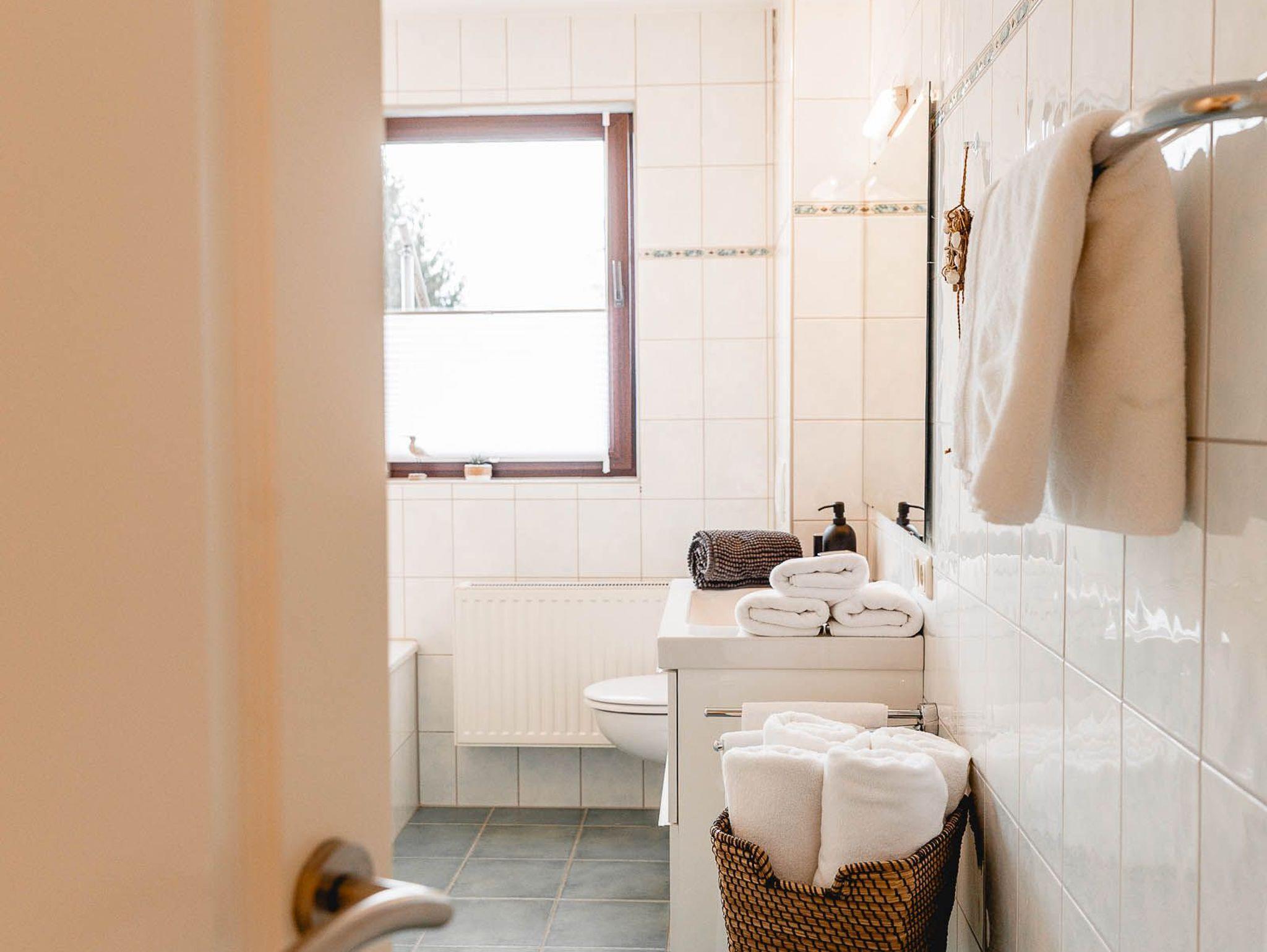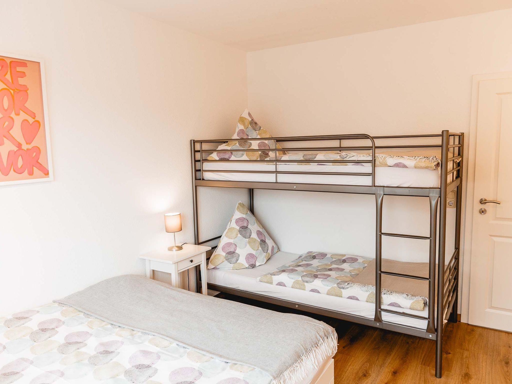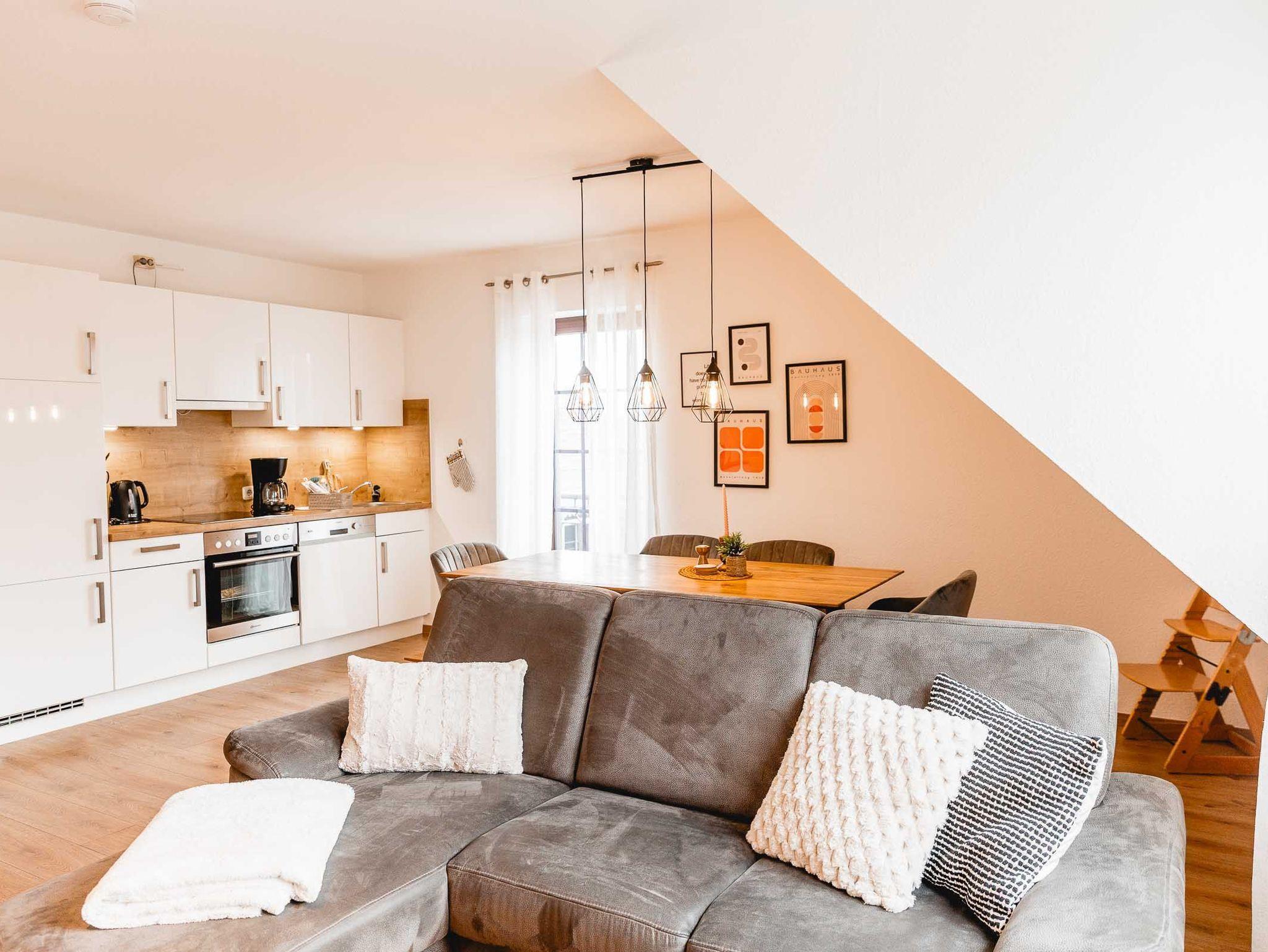 Die Wohnung Wümme befindet sich im OG unseres Haupthauses und bietet auf 80 qm Platz für bis zu sechs Personen. Aufgeteilt ist die Wohnung in zwei Schlafzimmer (1 SZ mit Doppelbett und 1 SZ mit zwei Einzelbetten, die sich jeweils zu einem vollständigen Doppelbett ausziehen lassen), einem großen Wohn/Essbereich mit komplett ausgestatteter Küchenzeile, einem Bad mit Tageslicht und einem Abstellraum.
