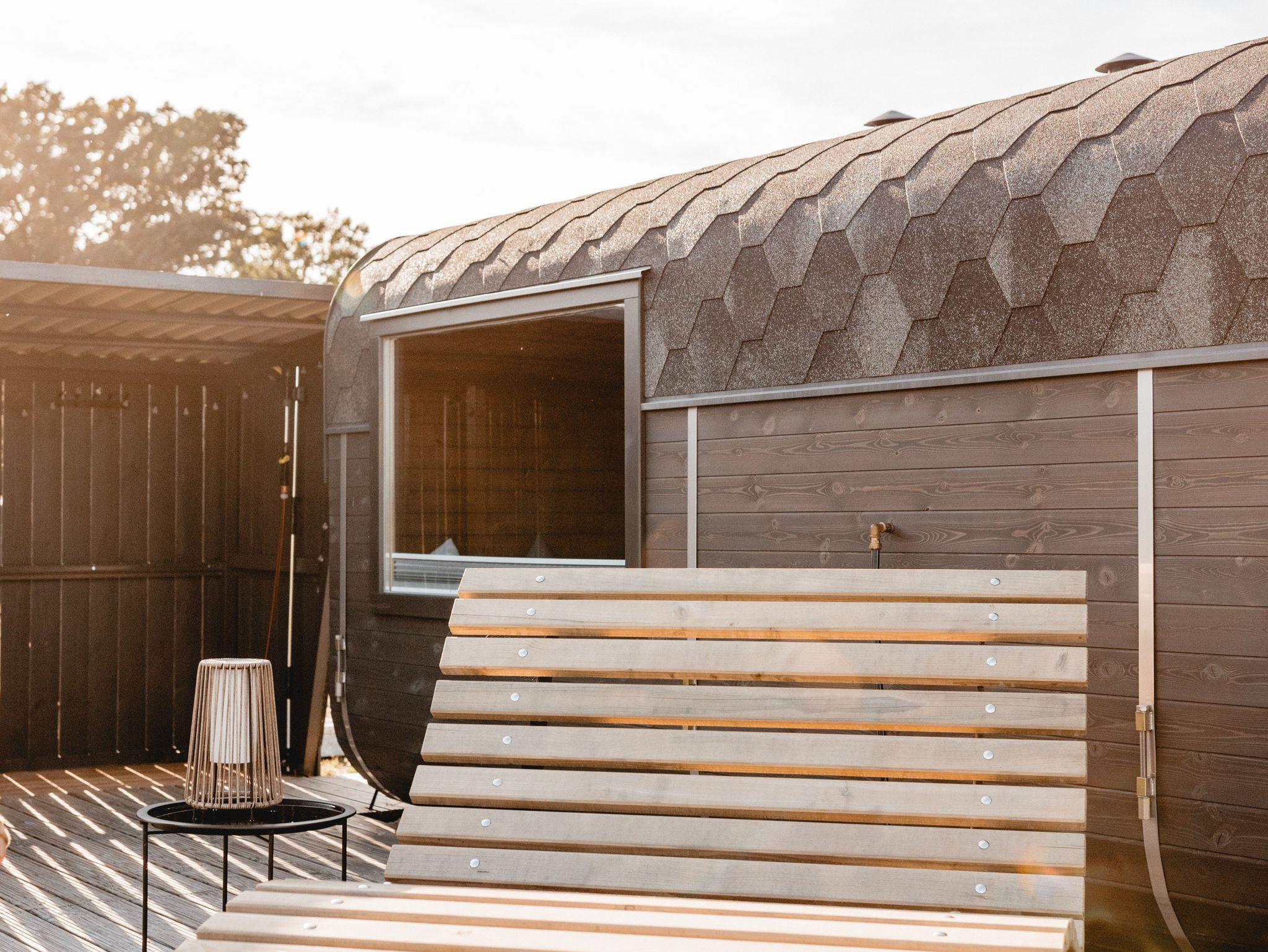Für eine Extraportion Entspannung sorgt unser Panorama-Saunafass. Lehnen Sie sich auf einer der beiden Wellenliegen zurück und genießen Sie den freien Blick über die Landschaft. Innen erwarten Sie eine Dusche und ein großzügiger Ruhebereich, außen eine Terrasse mit Himmelsliege ein wunderbarer Ort, um Körper und Seele in Einklang zu bringen.