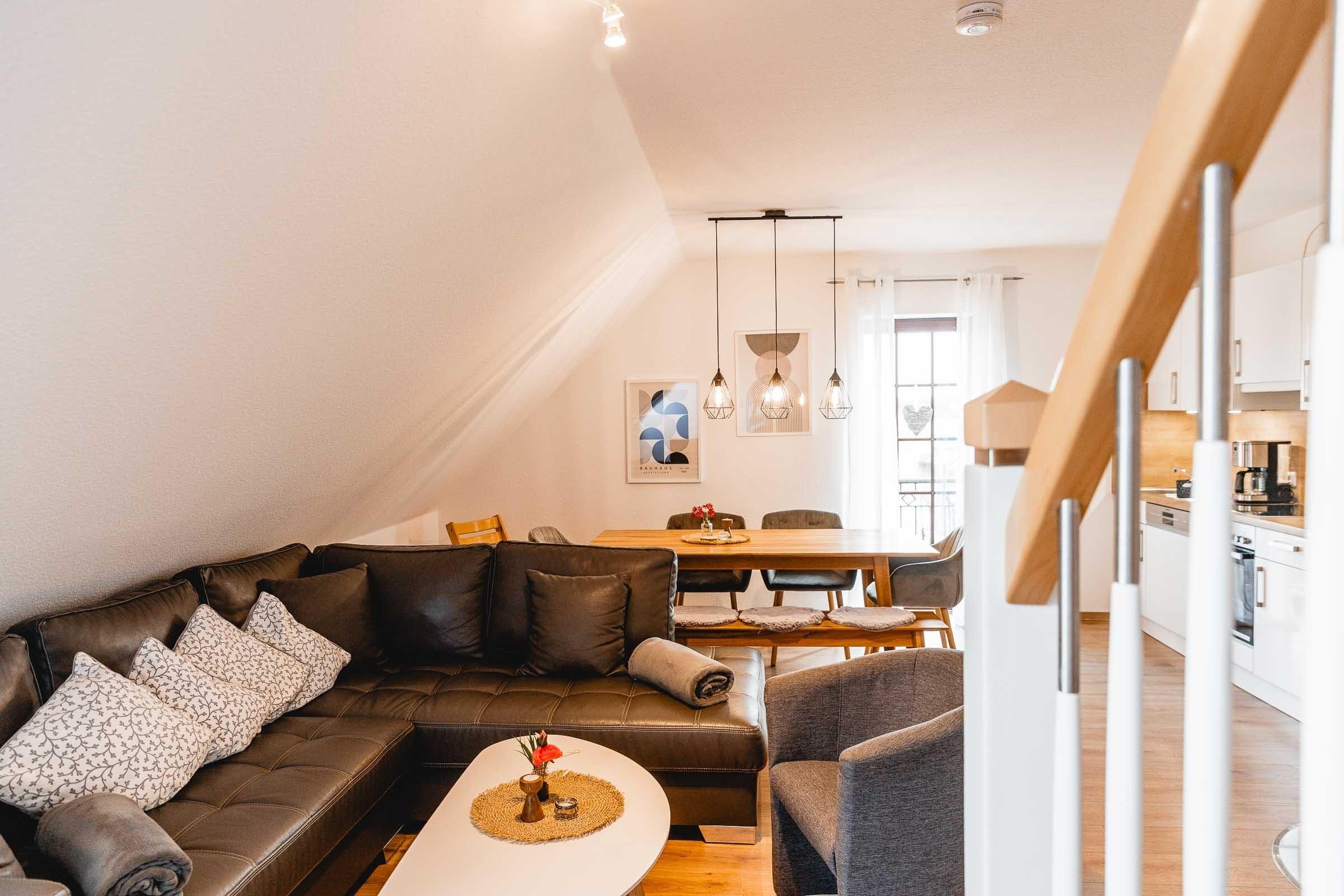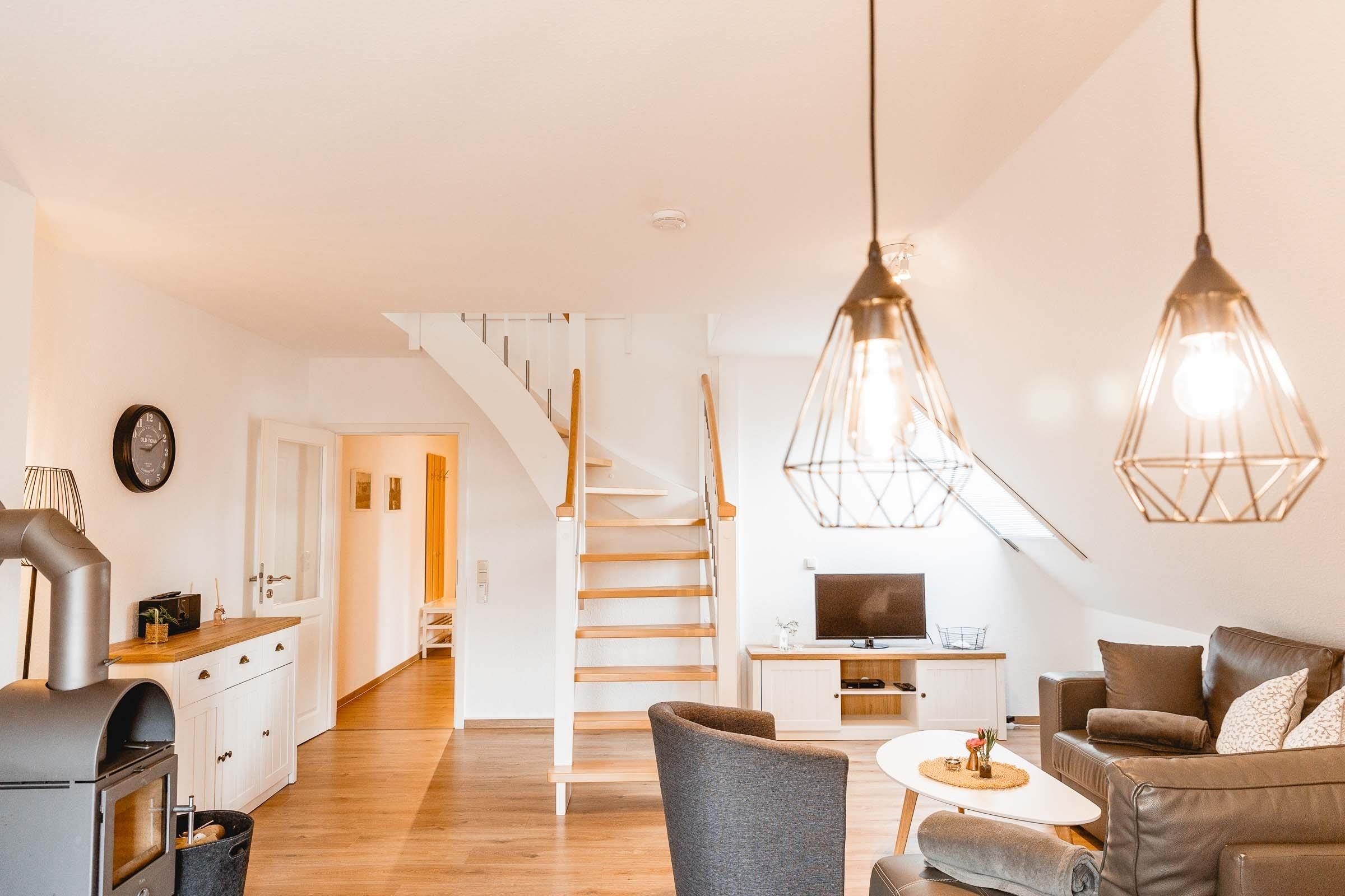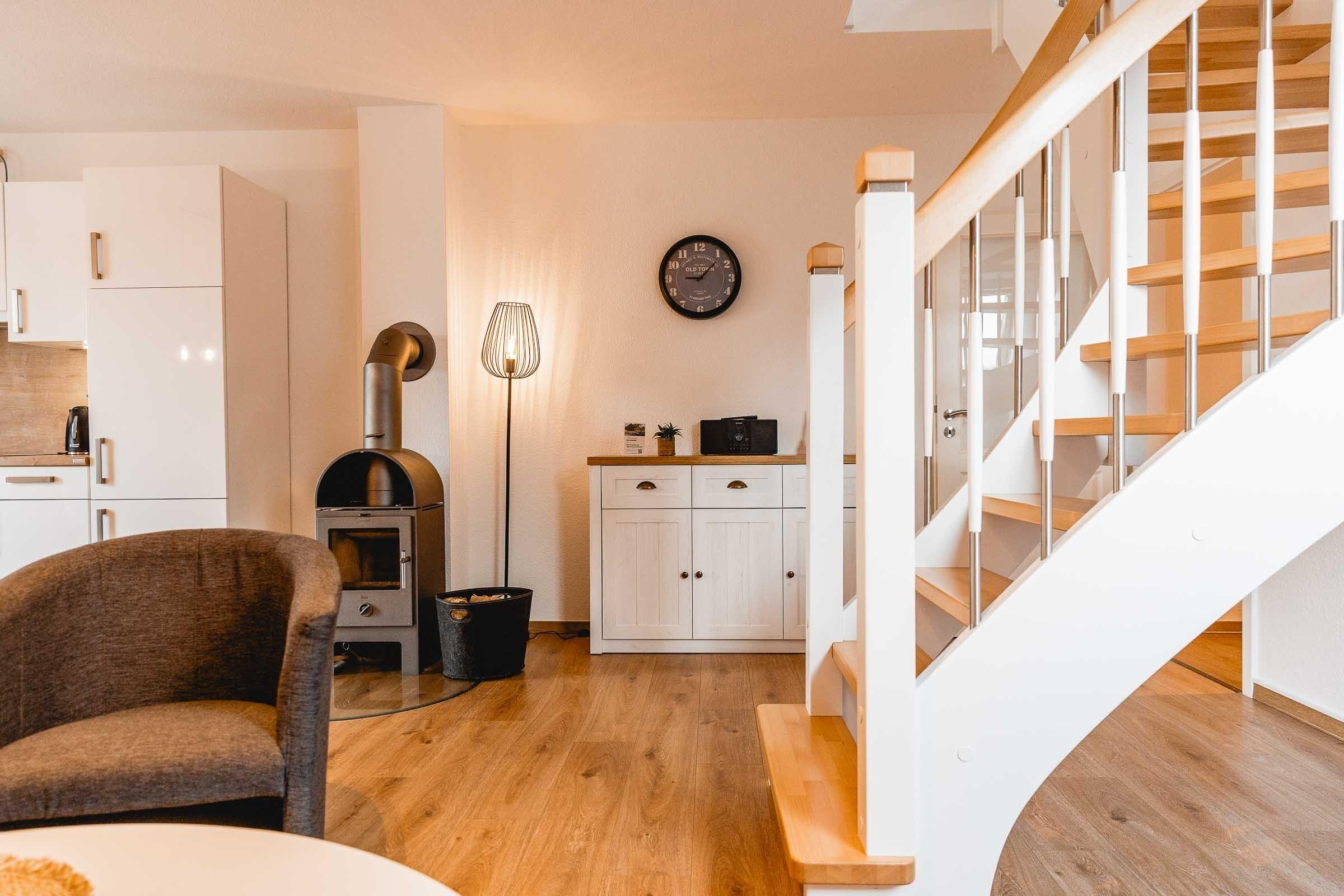 Die Wohnung Wörpe verfügt über einen großen Wohn/Essbereich, einem Bad/WC, 2 Schlafzimmer (1 Schlafzimmer mit Ehebett und 1 Schlafzimmer mit 2 Einzelbetten ausziehbar zu Doppelbetten). Das Schlafzimmer mit den ausziehbaren Betten erreicht man über eine Treppe vom Wohnzimmer aus.