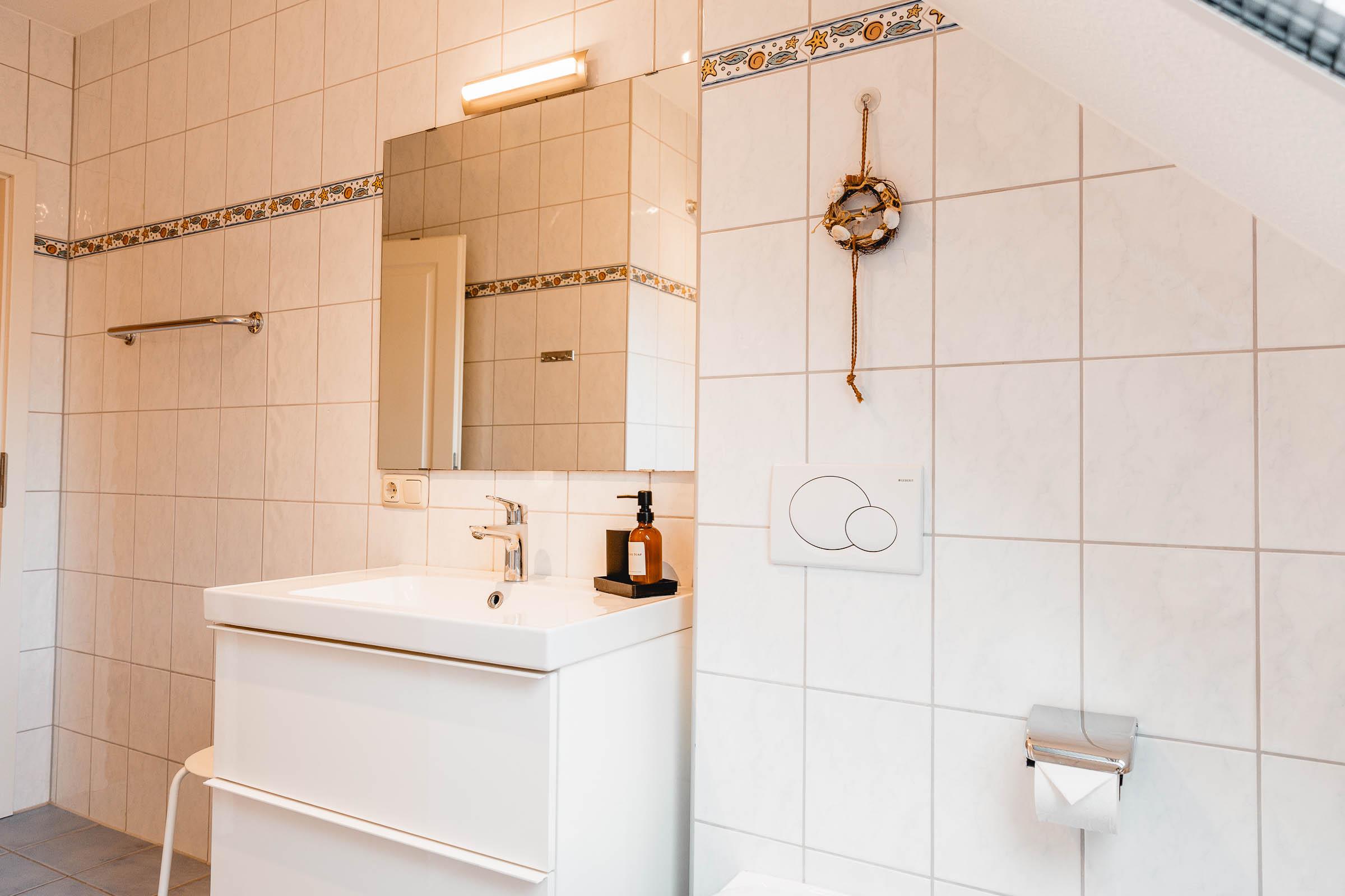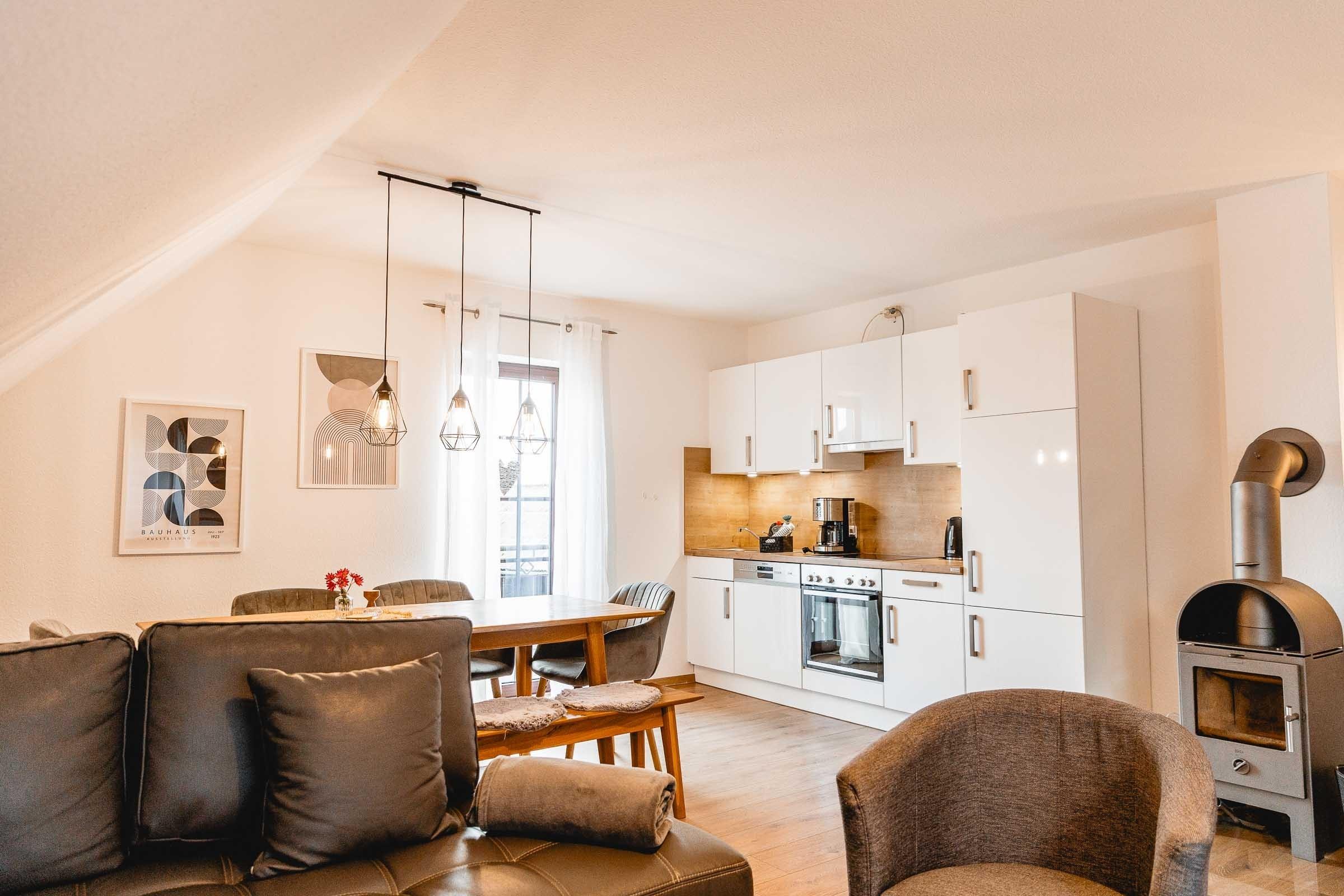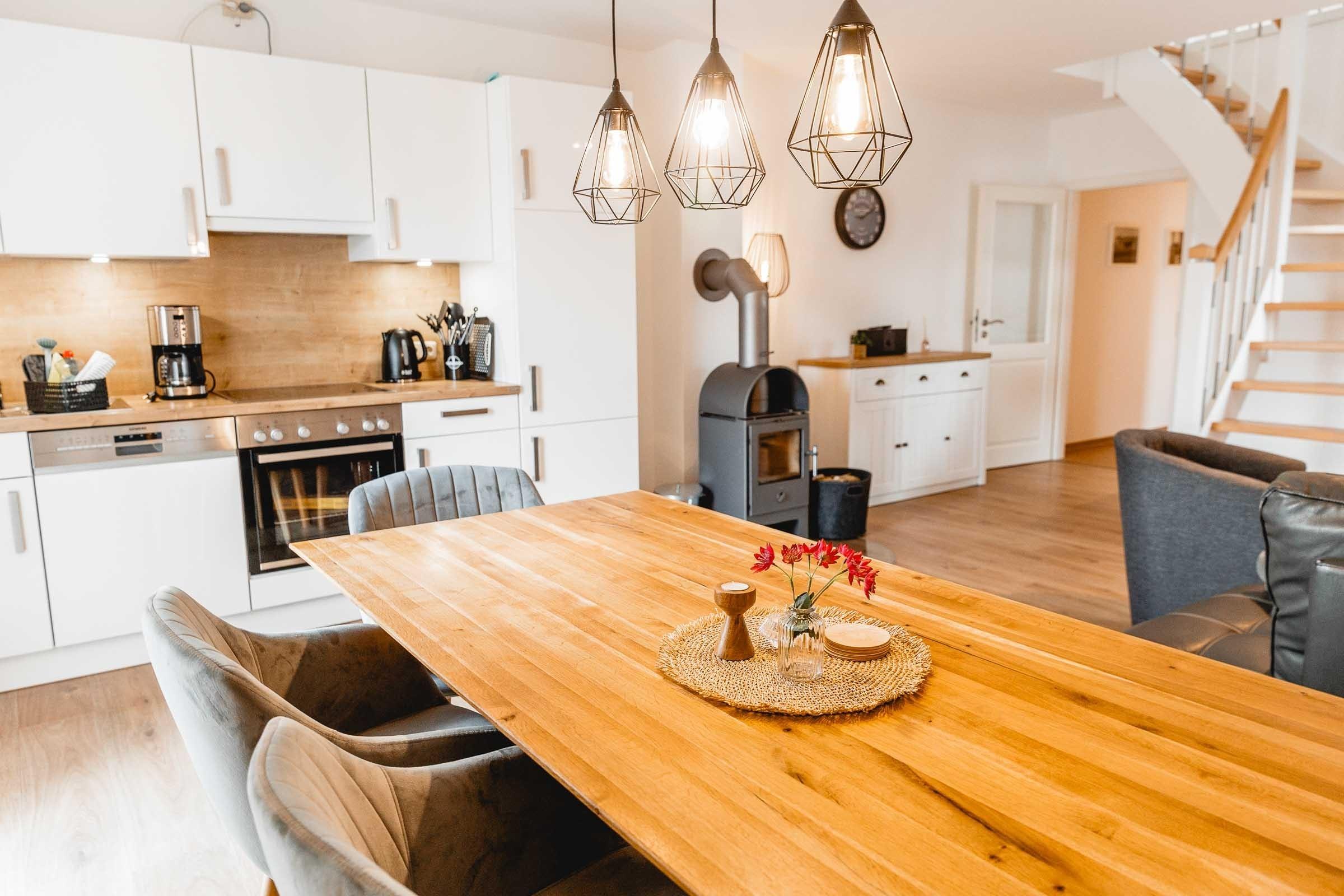 Die Wohnung Wörpe verfügt über einen großen Wohn/Essbereich, einem Bad/WC, 2 Schlafzimmer (1 Schlafzimmer mit Ehebett und 1 Schlafzimmer mit 2 Einzelbetten ausziehbar zu Doppelbetten). Das Schlafzimmer mit den ausziehbaren Betten erreicht man über eine Treppe vom Wohnzimmer aus.
