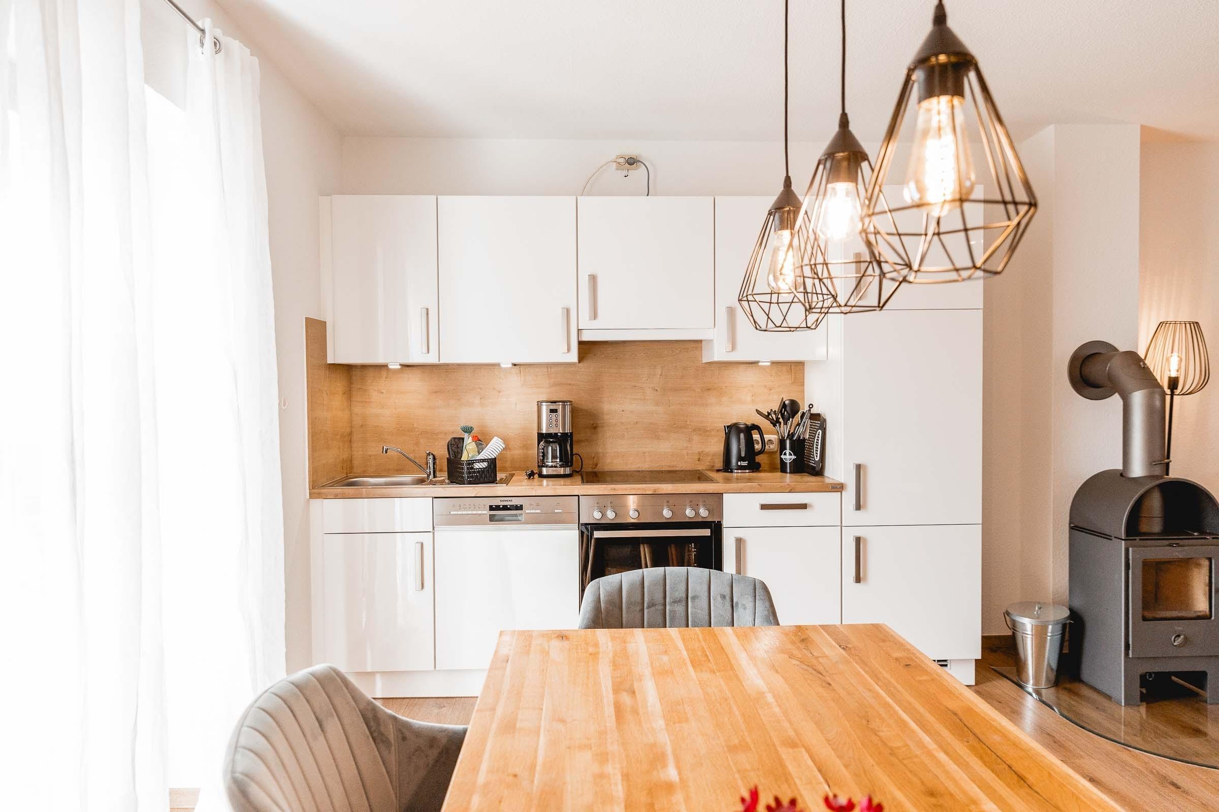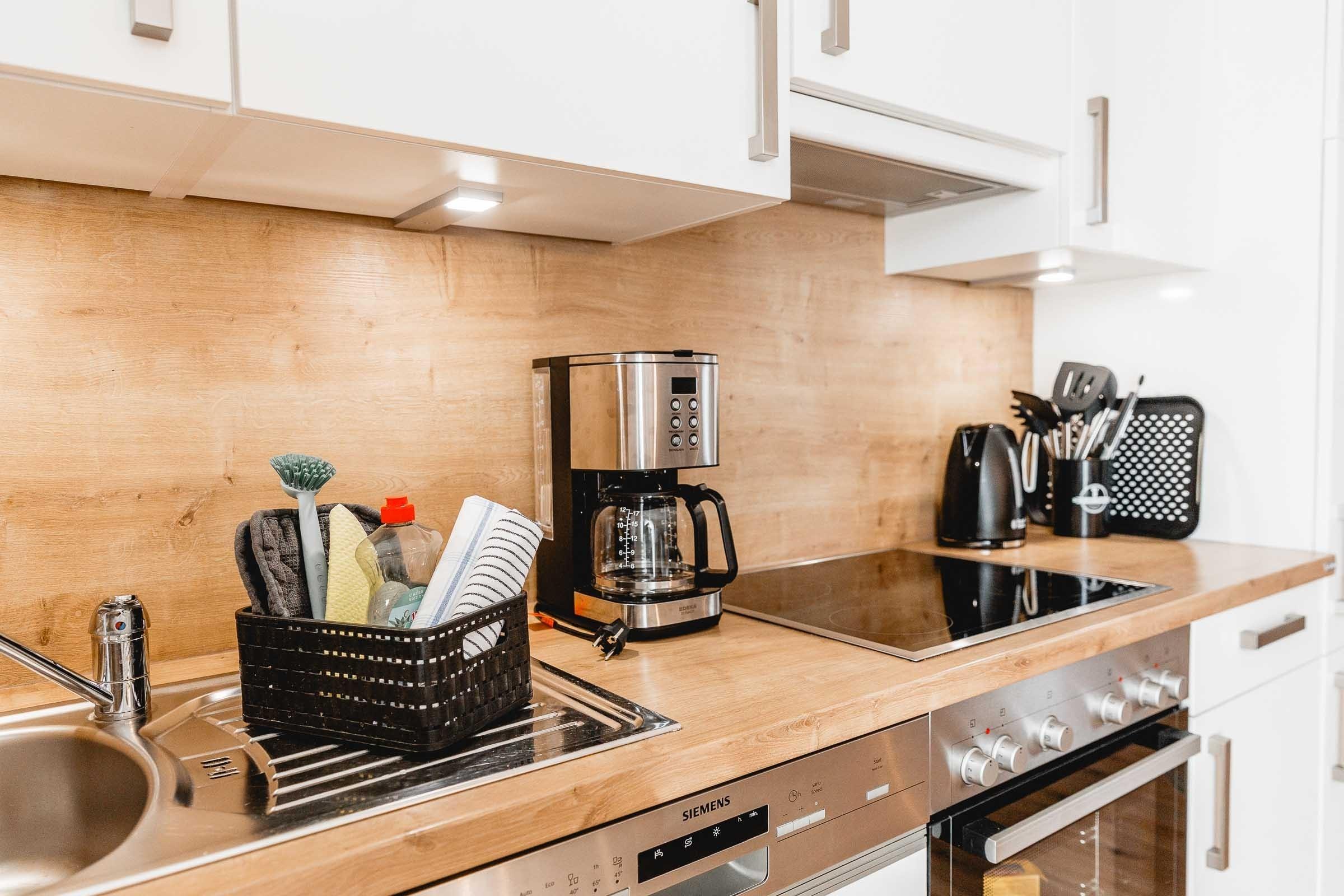Die komplett ausgestattete Küchenzeile verfügt u. a. über Geschirrspüler, Kaffeemaschine, Wasserkocher, Eierkocher, Küchenwaage, Küchenmaschine, Mikrowelle, Cerankochfeld und Backofen.