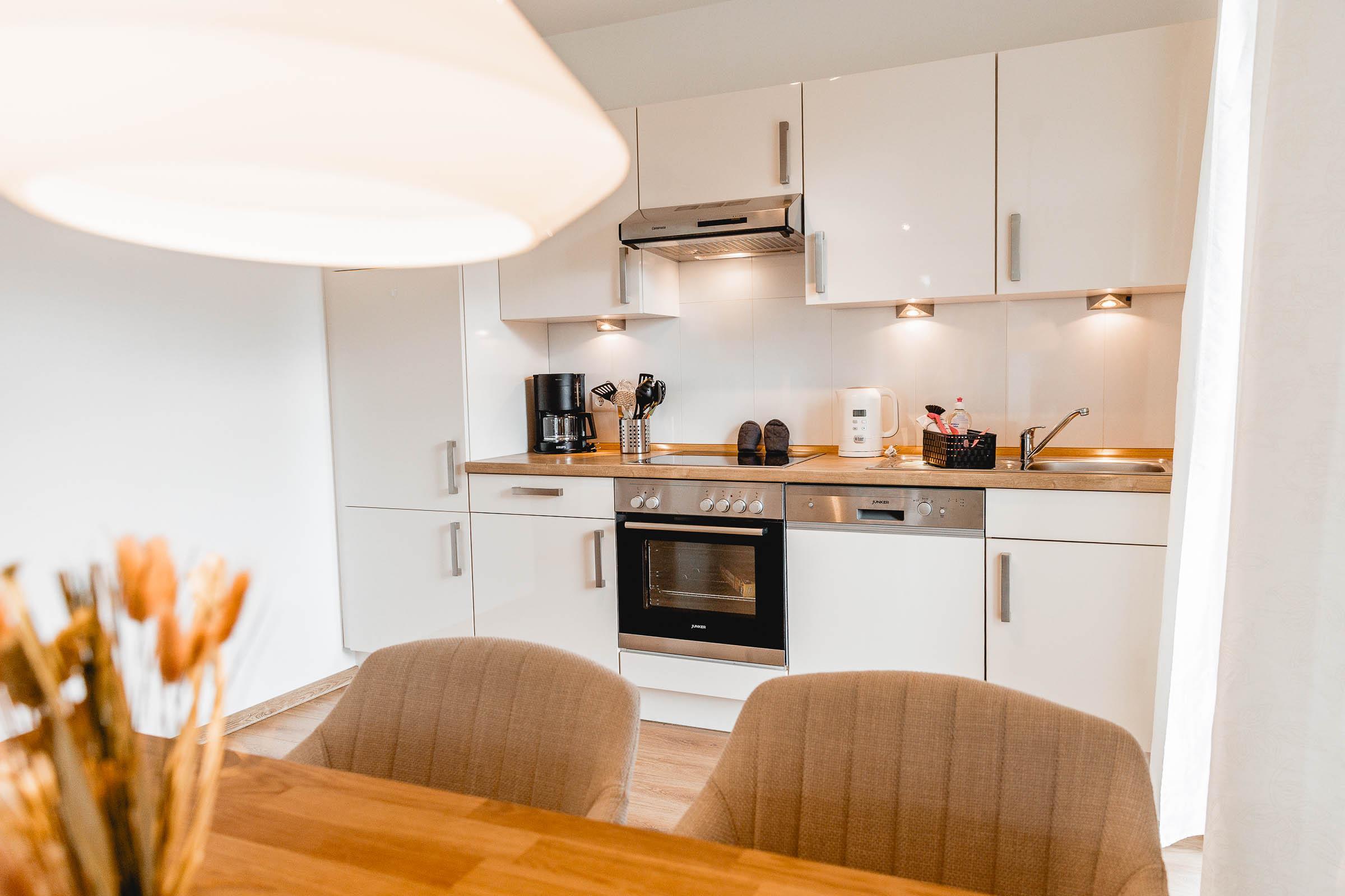 Die komplett ausgestattete Küchenzeile verfügt u. a. über Geschirrspüler, Backofen, Cerankochfeld, Küchlschrank mit Gefrierfach, Kaffeemaschine, Wasserkocher, Eierkocher, Küchenwaage, Handrührgerät.