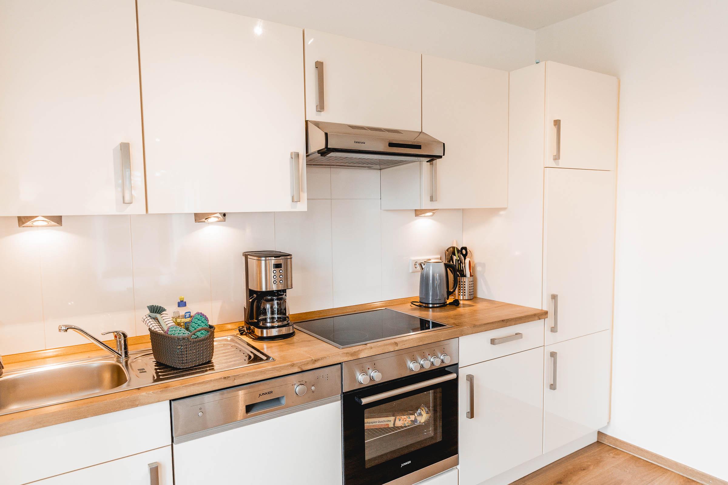 Die komplett ausgestattete Küchenzeile verfügt u. a. über Geschirrspüler, Backofen, Cerankochfeld, Küchlschrank mit Gefrierfach, Kaffeemaschine, Wasserkocher, Eierkocher, Küchenwaage, Handrührgerät.