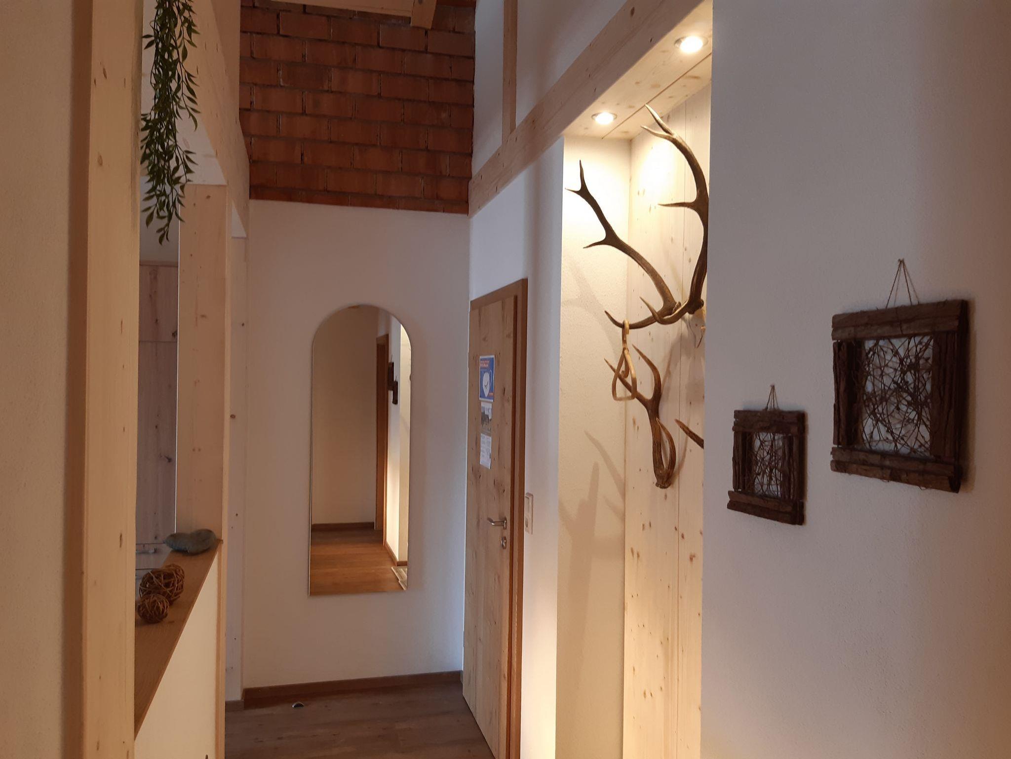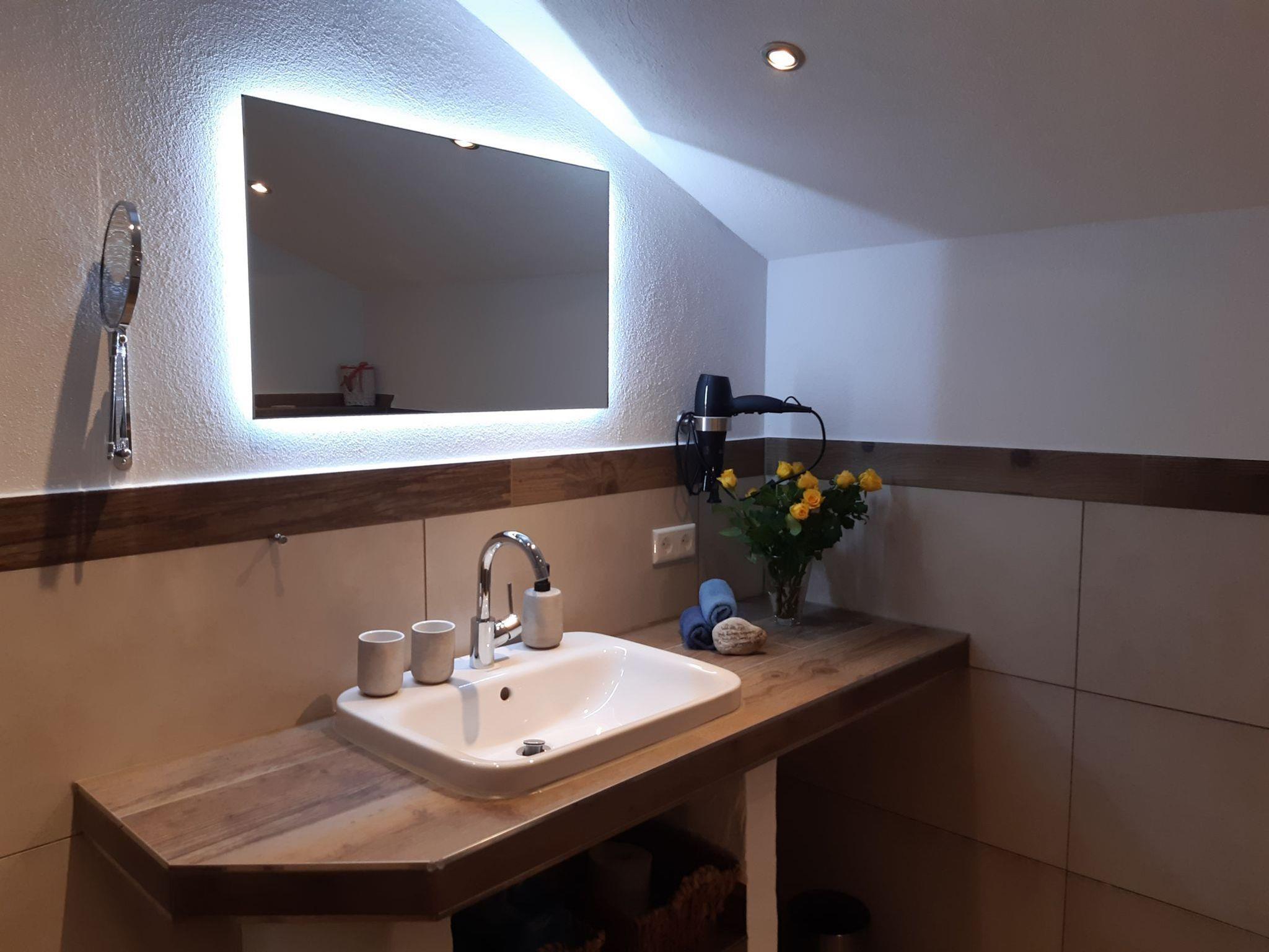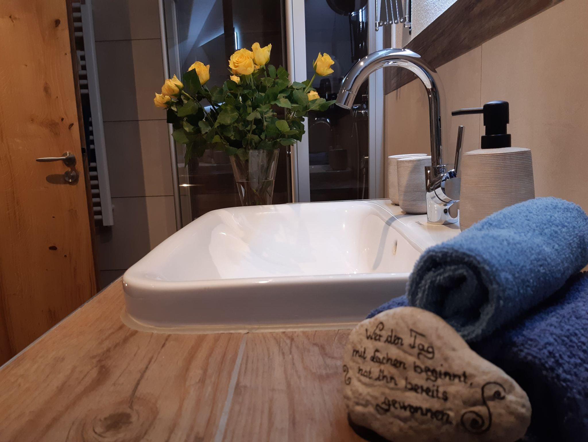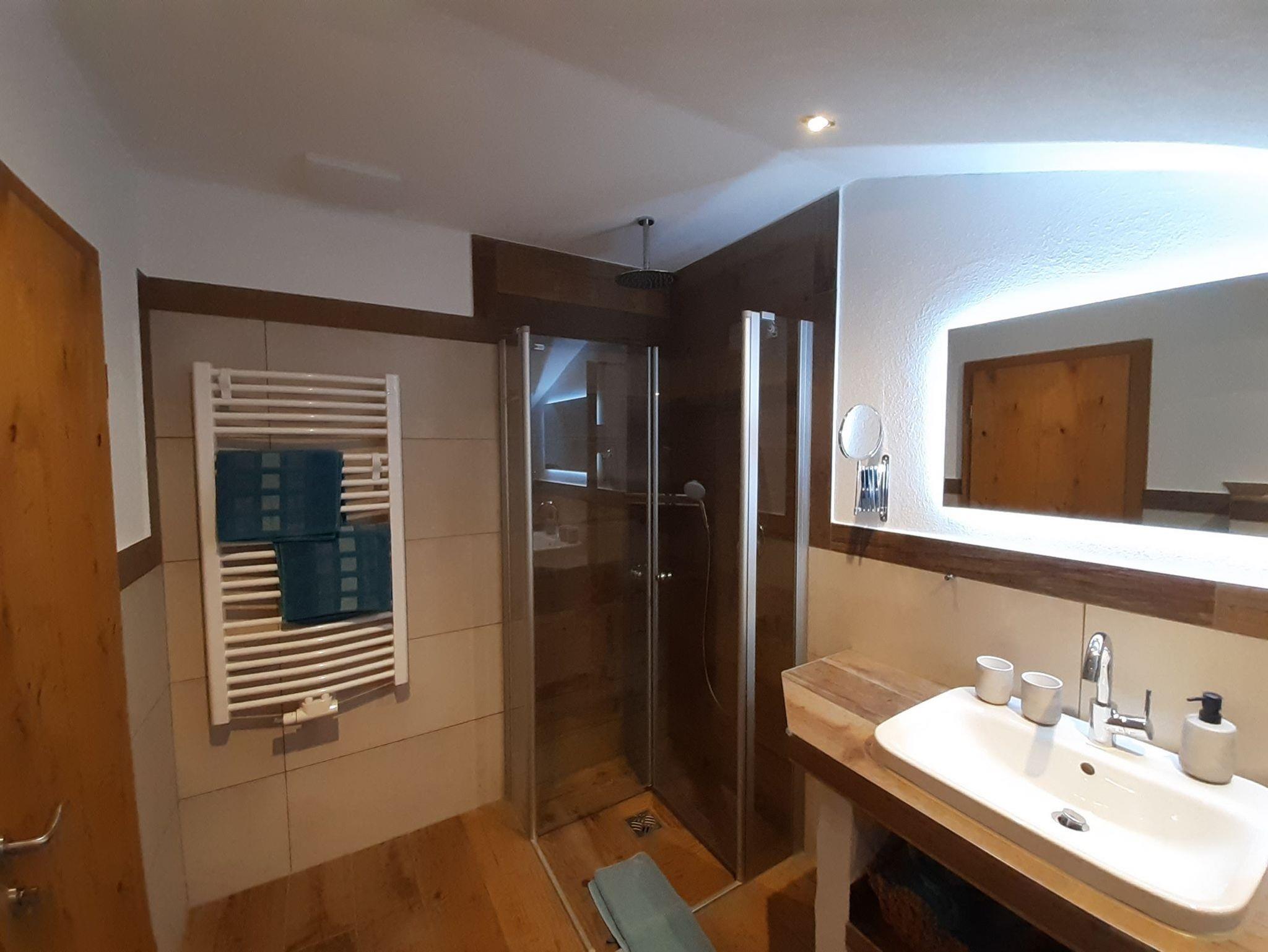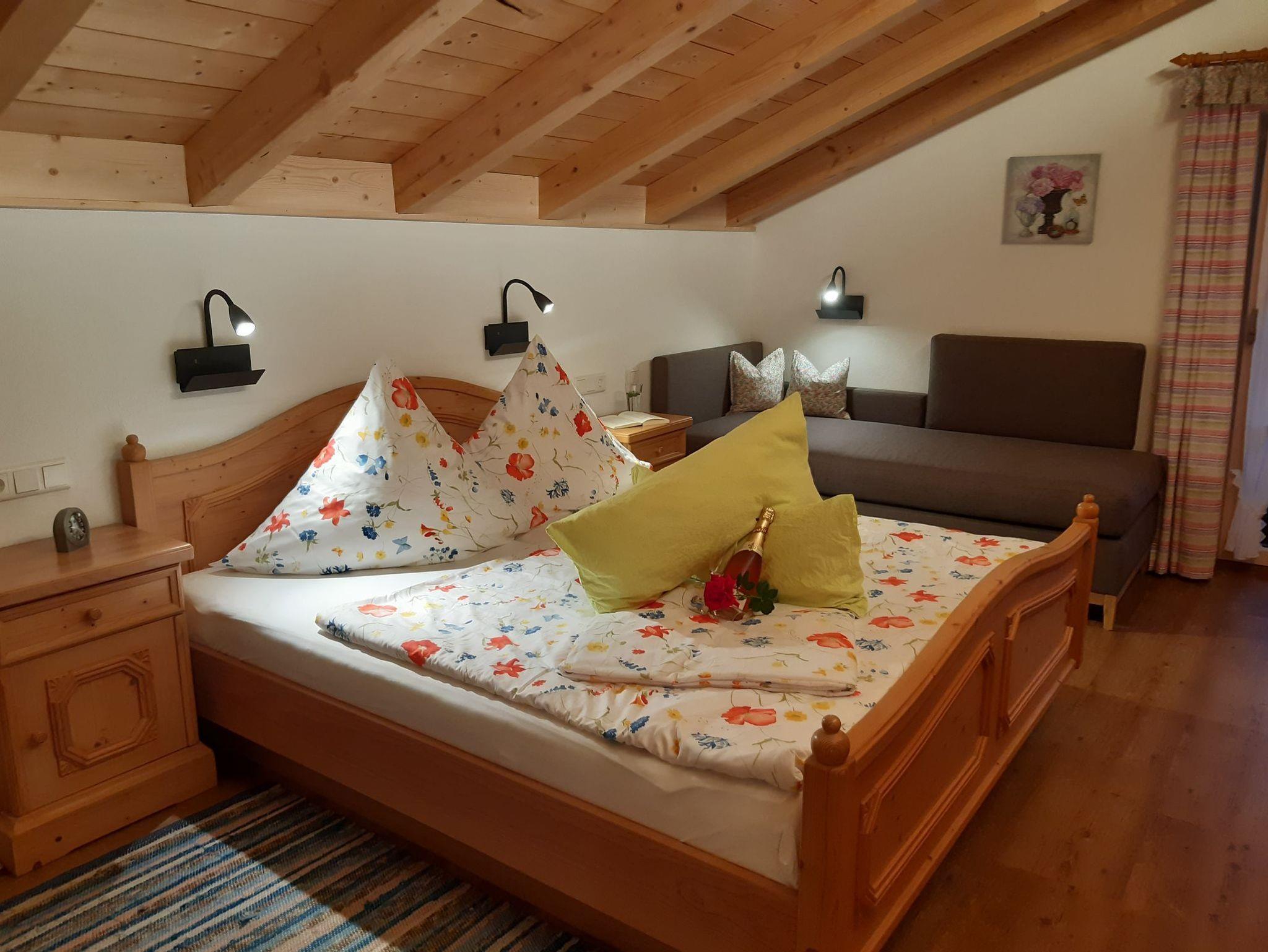 Unsere neu ausgebaute Ferienwohnung Nikolaus für 2-3 Personen, bietet durch den Sichtdachstuhl und das massive Mobiliar eine ausgesprochen stilvolle, mit Liebe eingerichtete und wohnliche Atmosphäre, edel und gemütlich zugleich !Das Bad verfügt über eine ebenerdige Regendusche, WC, Fußbodenheizung, eingebautem Radio und einem hinter beleuchteten Spiegel.Am Morgen können Sie auf dem ruhigen Ostbalkon die Sonne und die herrlichen Berge genießen und somit auch Ihr Frühstück gemütlich zu sich ttwäsche und verschiedene Handtücher sind vorhanden.